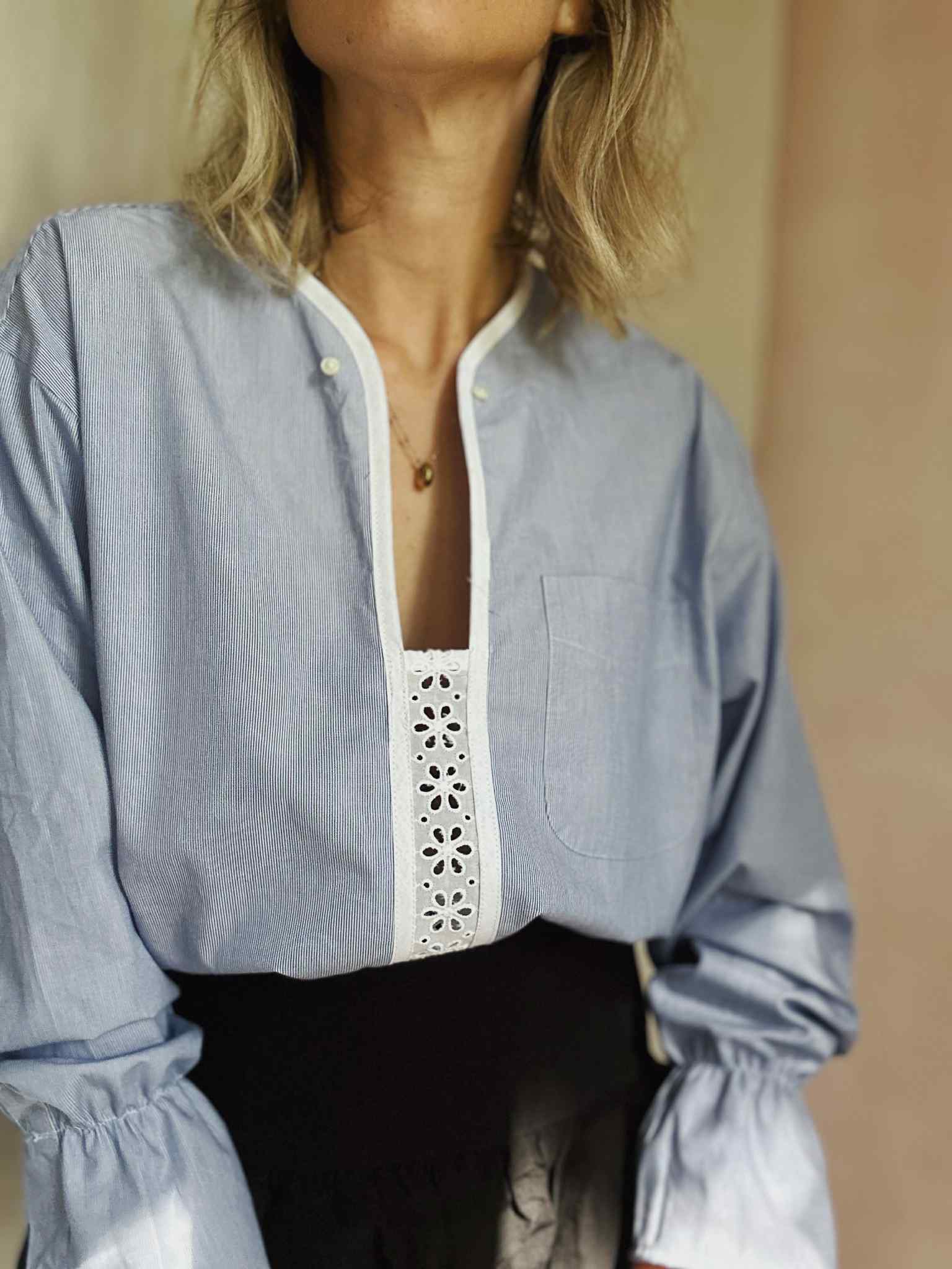 La ligne Intuitive est confectionnée sur des chemises de seconde main. Des pièces spontanées, créatives & précieuses pour des chemises uniques à collectionner.