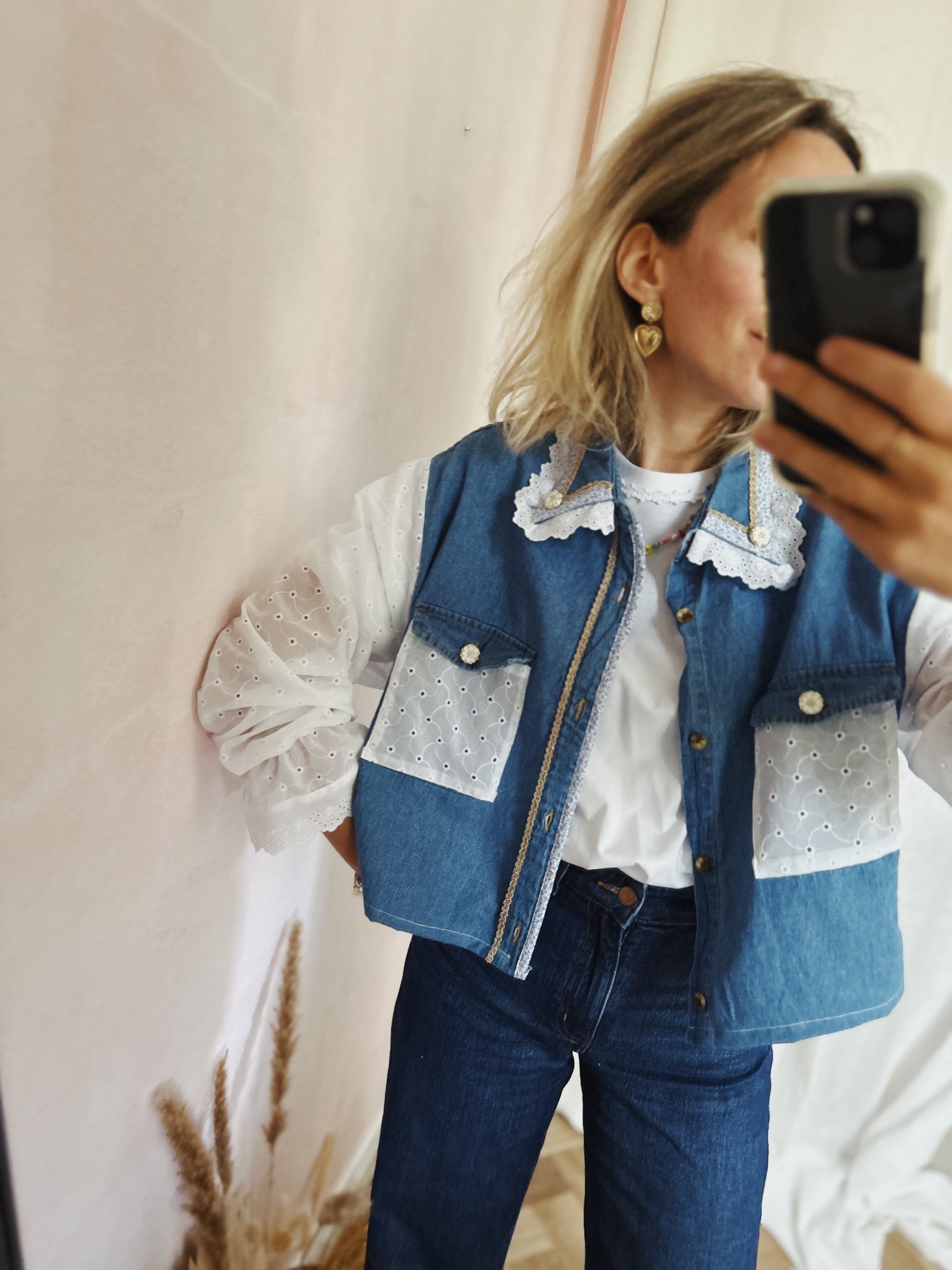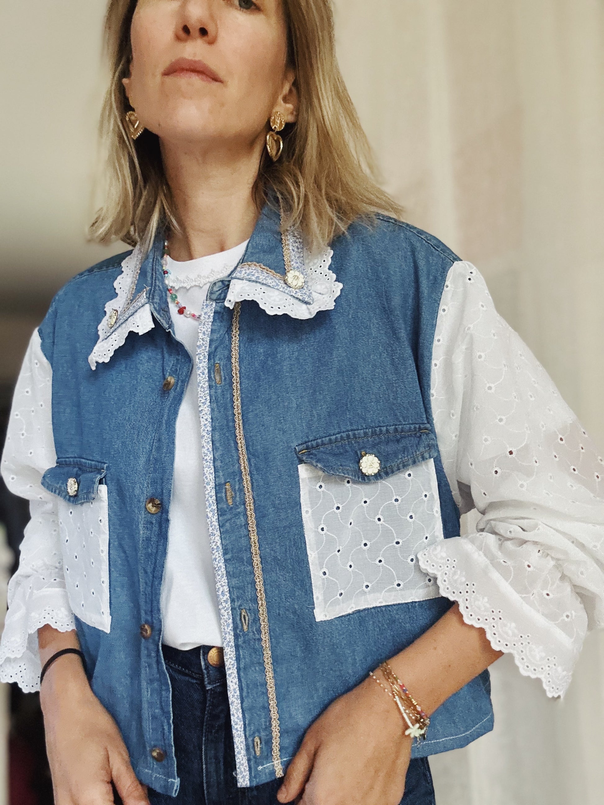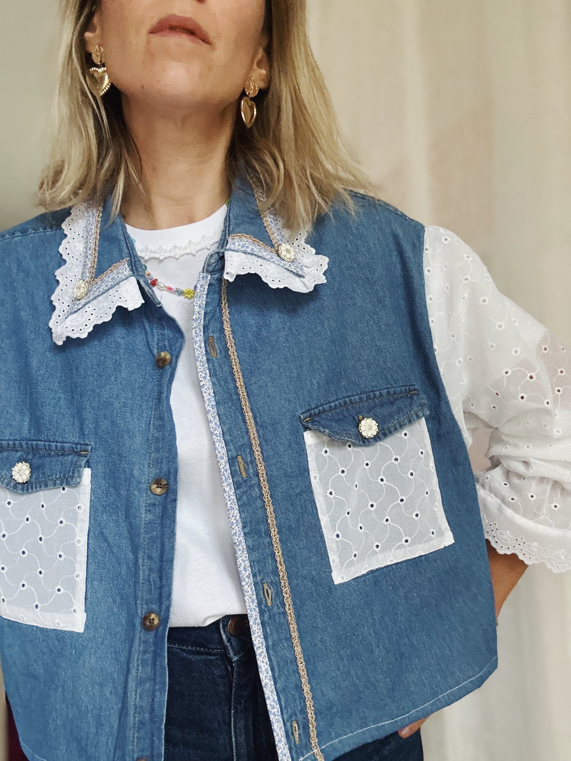 Base chemise en jean / col orné de broderie anglaise biais liberty et boutons bijoux / poches et manches en broderie anglaise issue de stock dormant d'une maison de luxe / bas de manches élastiqués.