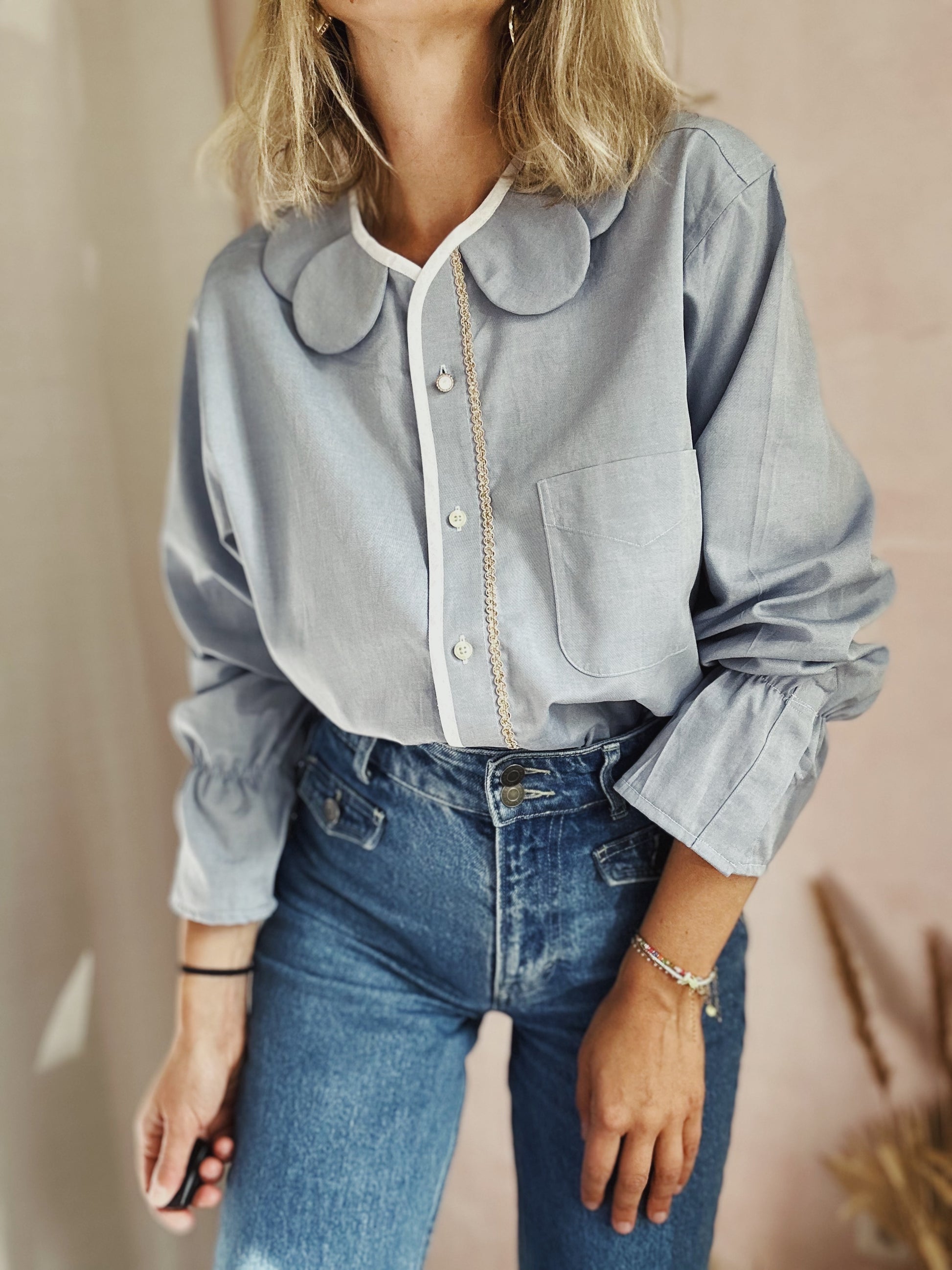 Les détails signature : encolure ornée de pétales / biais en coton et galon doré soulignant le milieu devant / bas de manches élastiqués / bouton bijou sur le haut de la chemise