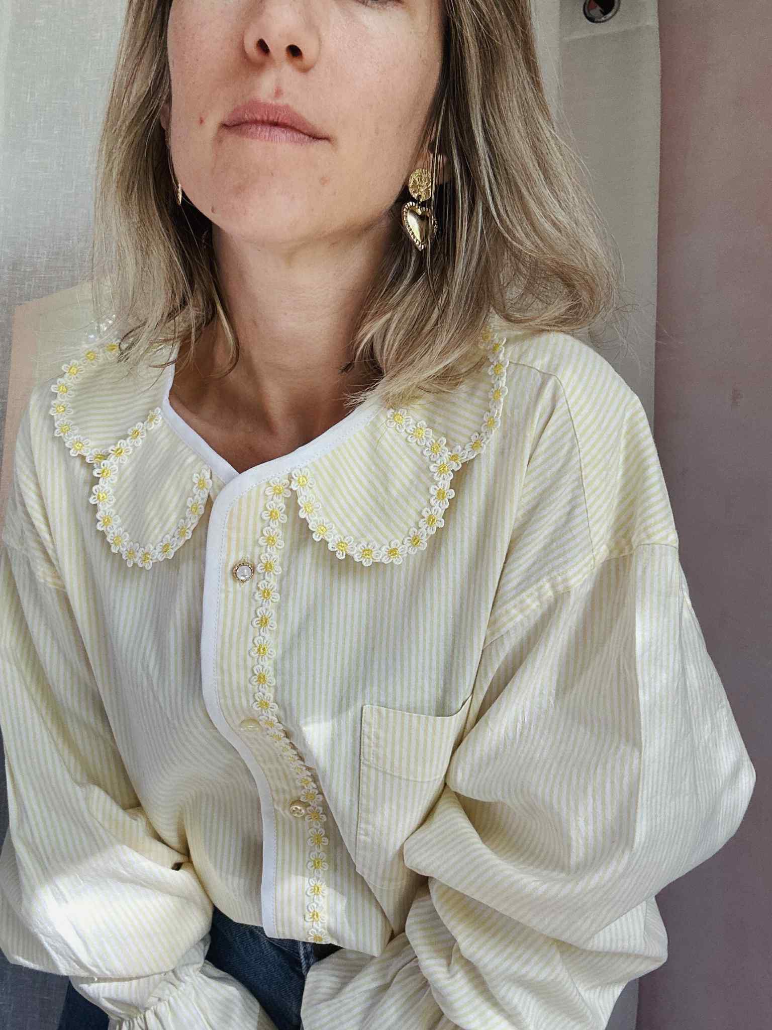Les détails signature : encolure ornée de pétales soulignées d'une guipure de margurites / biais en coton et guipure soulignant le milieu devant / bas de manches élastiqués / bouton bijou sur le haut de la chemise