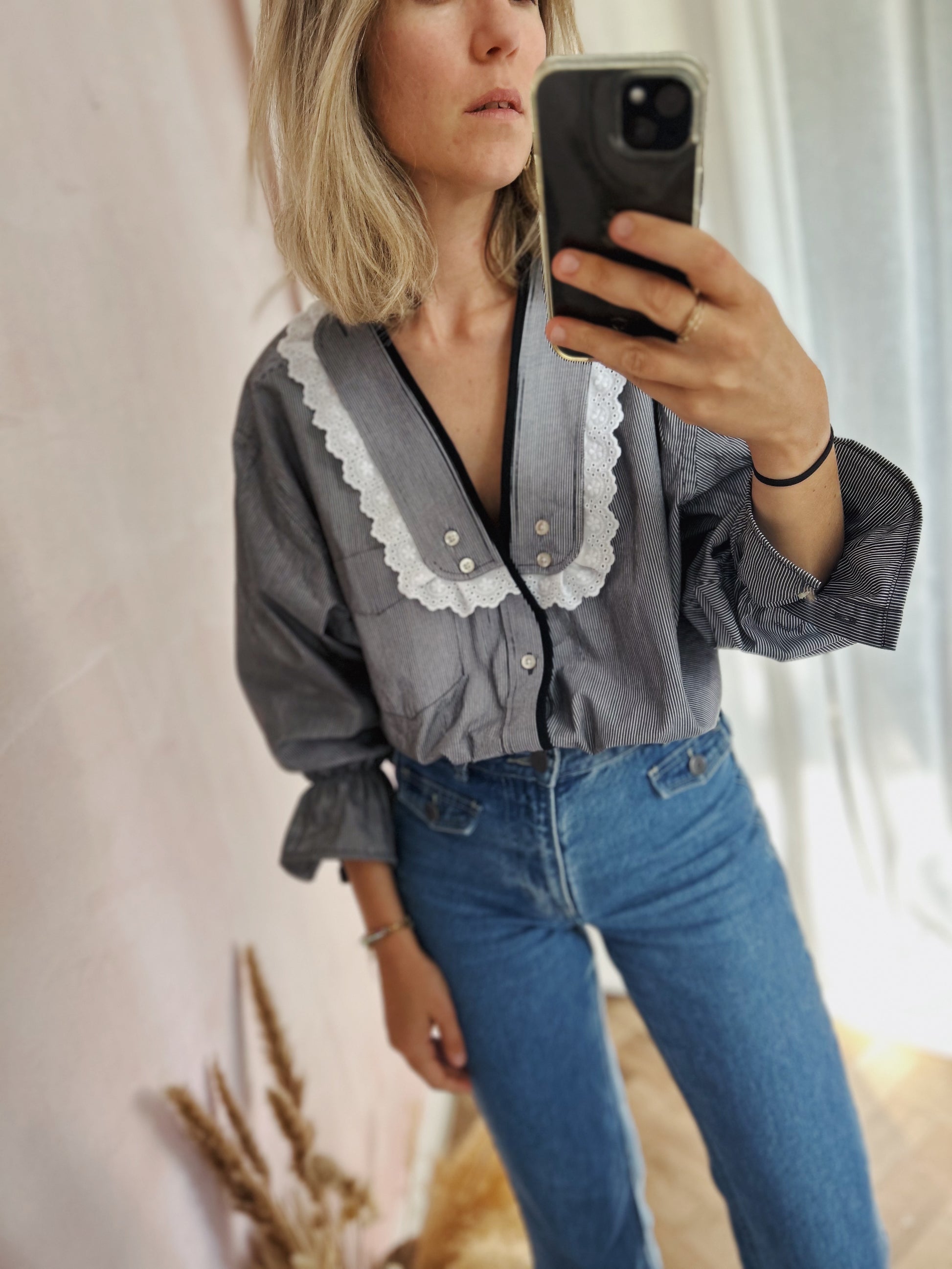 Les détails signature : col V avec empiècements soulignés d'une broderie anglaise / bas de manches élastiqués / biais coton soulignant le milieu devant / finition ourlet