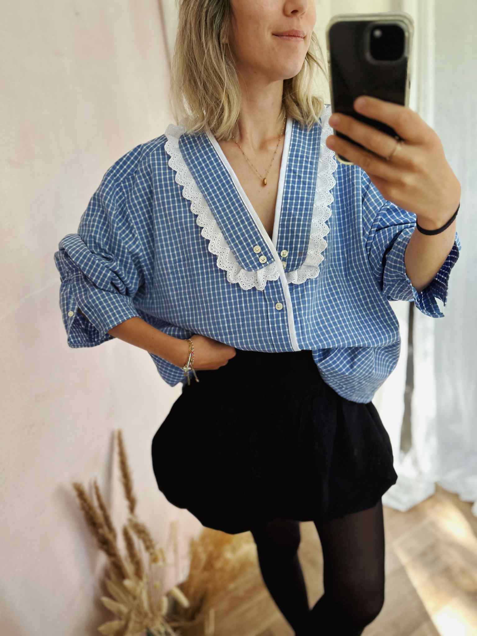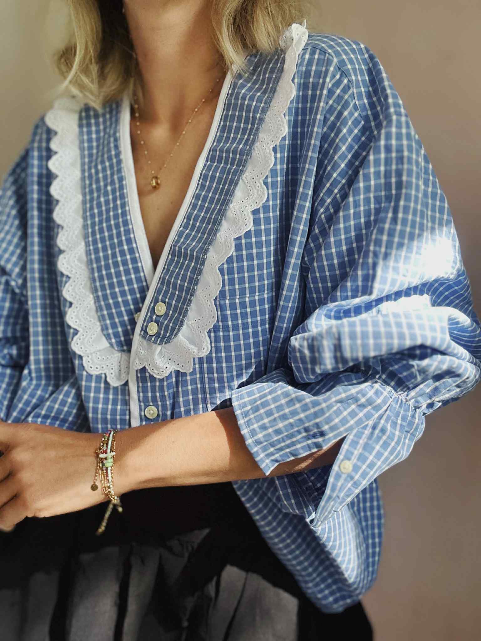 Les détails signature : col V avec empiècements soulignés d'une broderie anglaise / bas de manches élastiqués / Finition biais coton