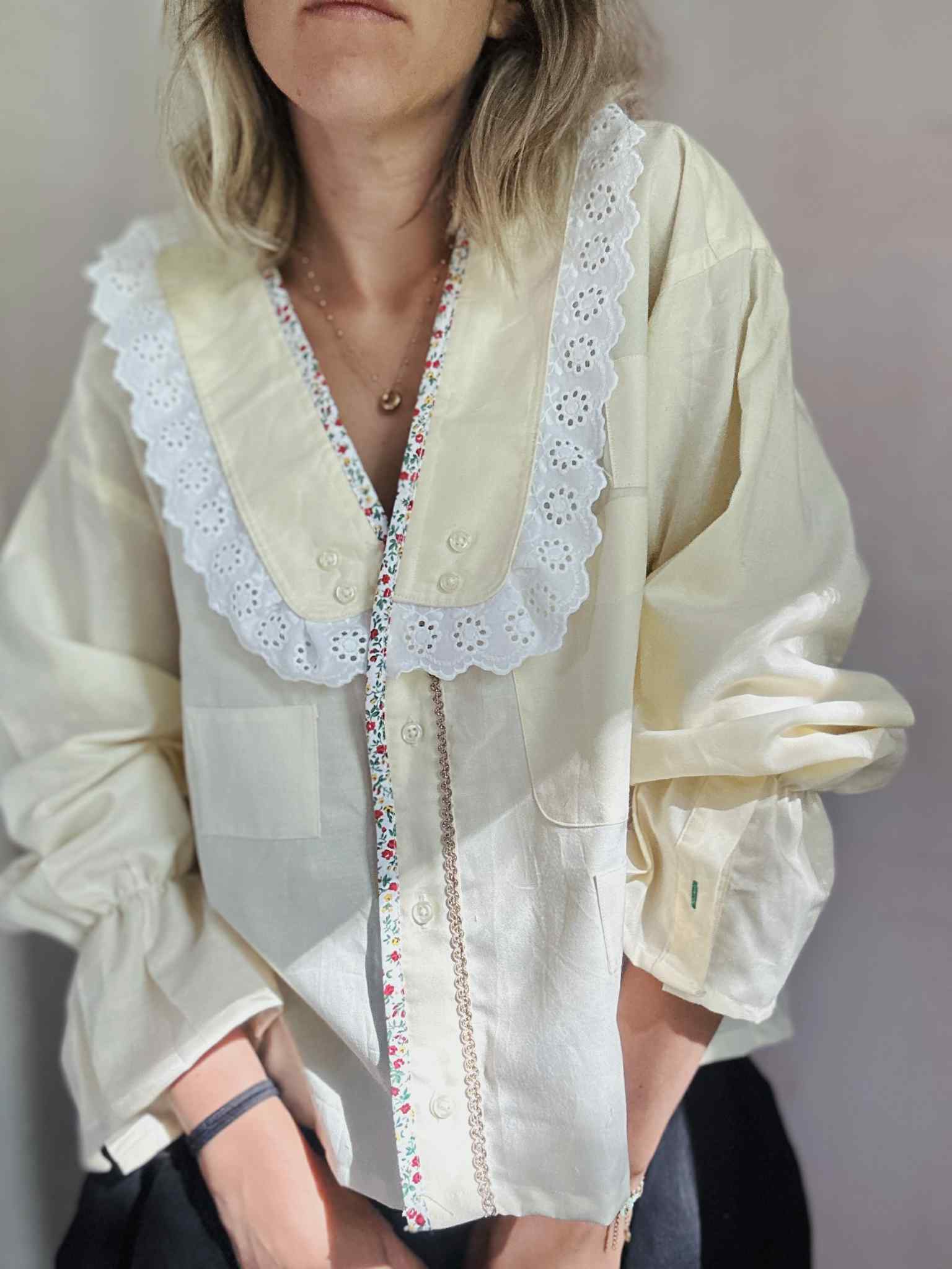 Les détails signature : col V avec empiècements soulignés d'une broderie anglaise / bas de manches élastiqués / Finition biais coton liberty et galon doré