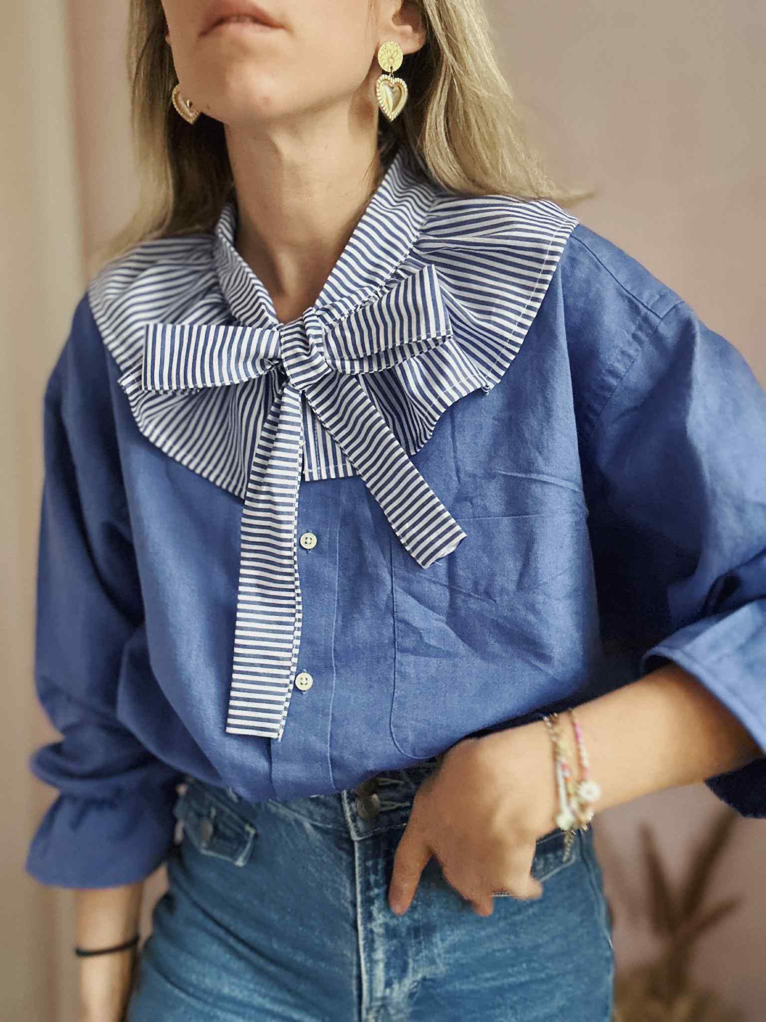 Chemise bleu azur/ col iconique Matsha à rayures / bas de manches élastiqués