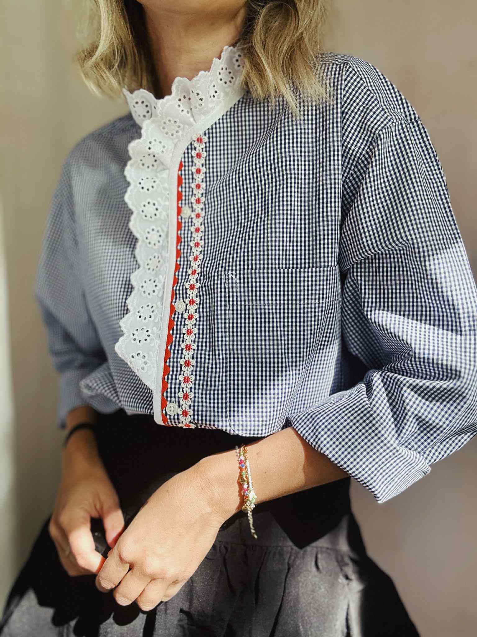 Chemise vichy / broderie anglaise milieu devant et encolure / finition biais coton croquet et guipure marguerite