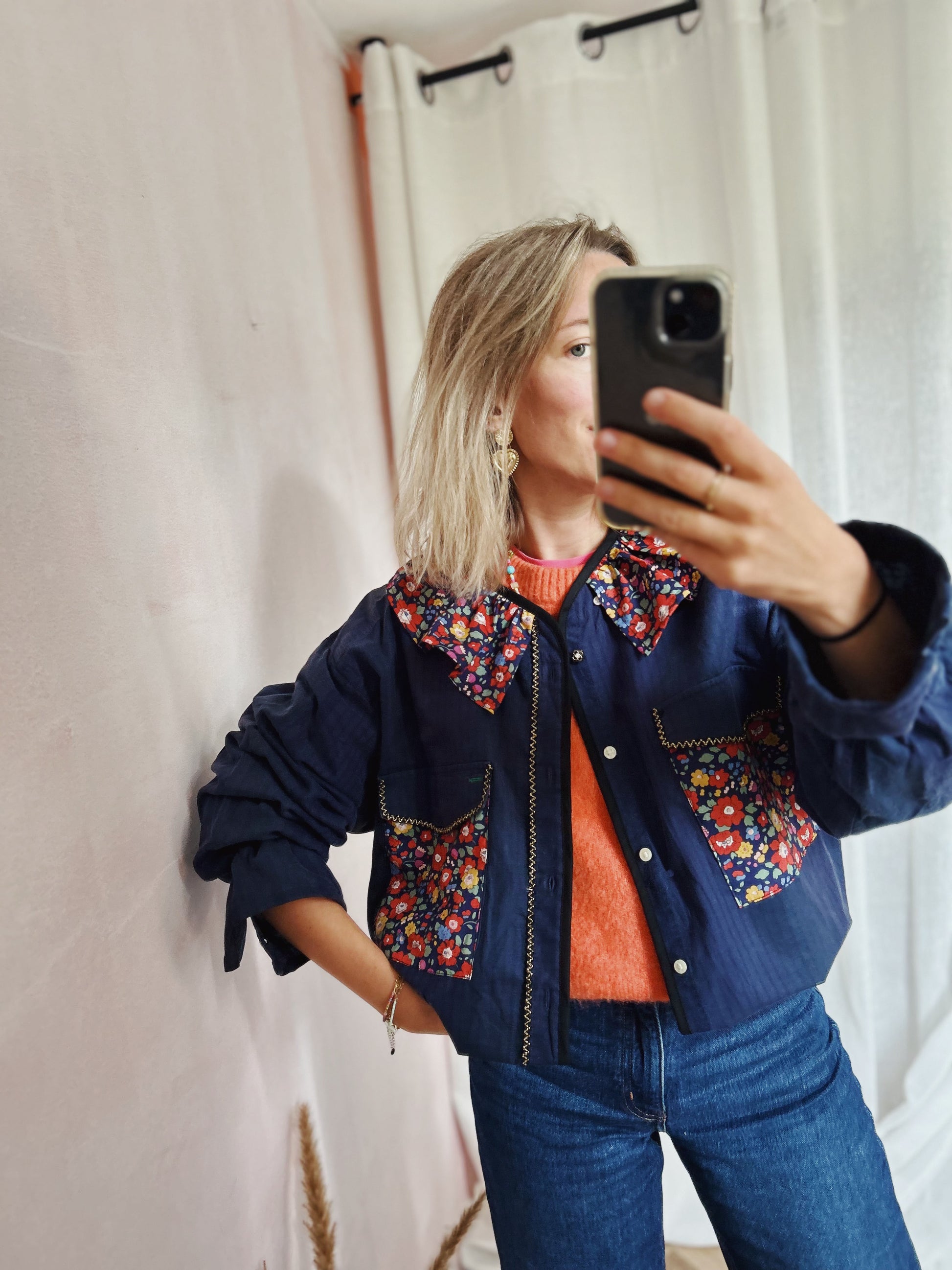 Volant liberty fabrics soulignant l'encolure / maxis poches liberty / galon doré / bouton bijou en haut de la chemise / bas de manches élastiquées / se porte en surchemise