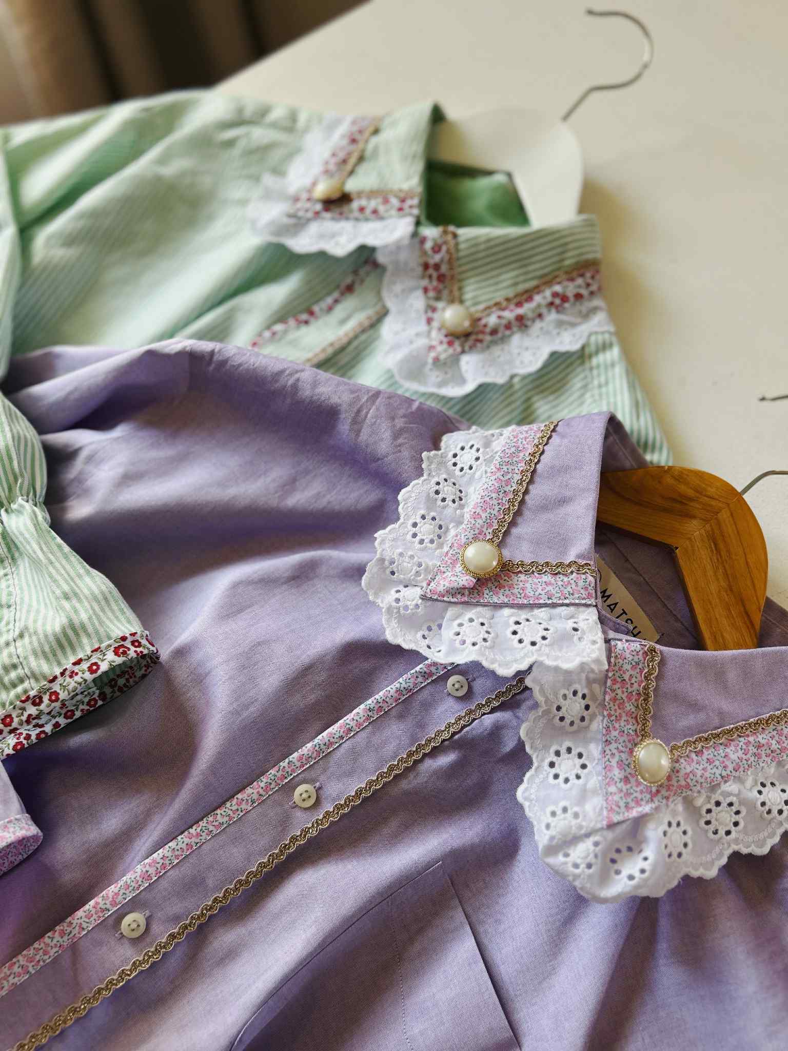 Chemise lila/ Col en broderie anglaise brodé de boutons bijoux et orné d'un galon doré / biais liberty soulignant le col le milieu devant et les bas de manches / Boutons bijoux sur le col / bas de manches élastiqués /
