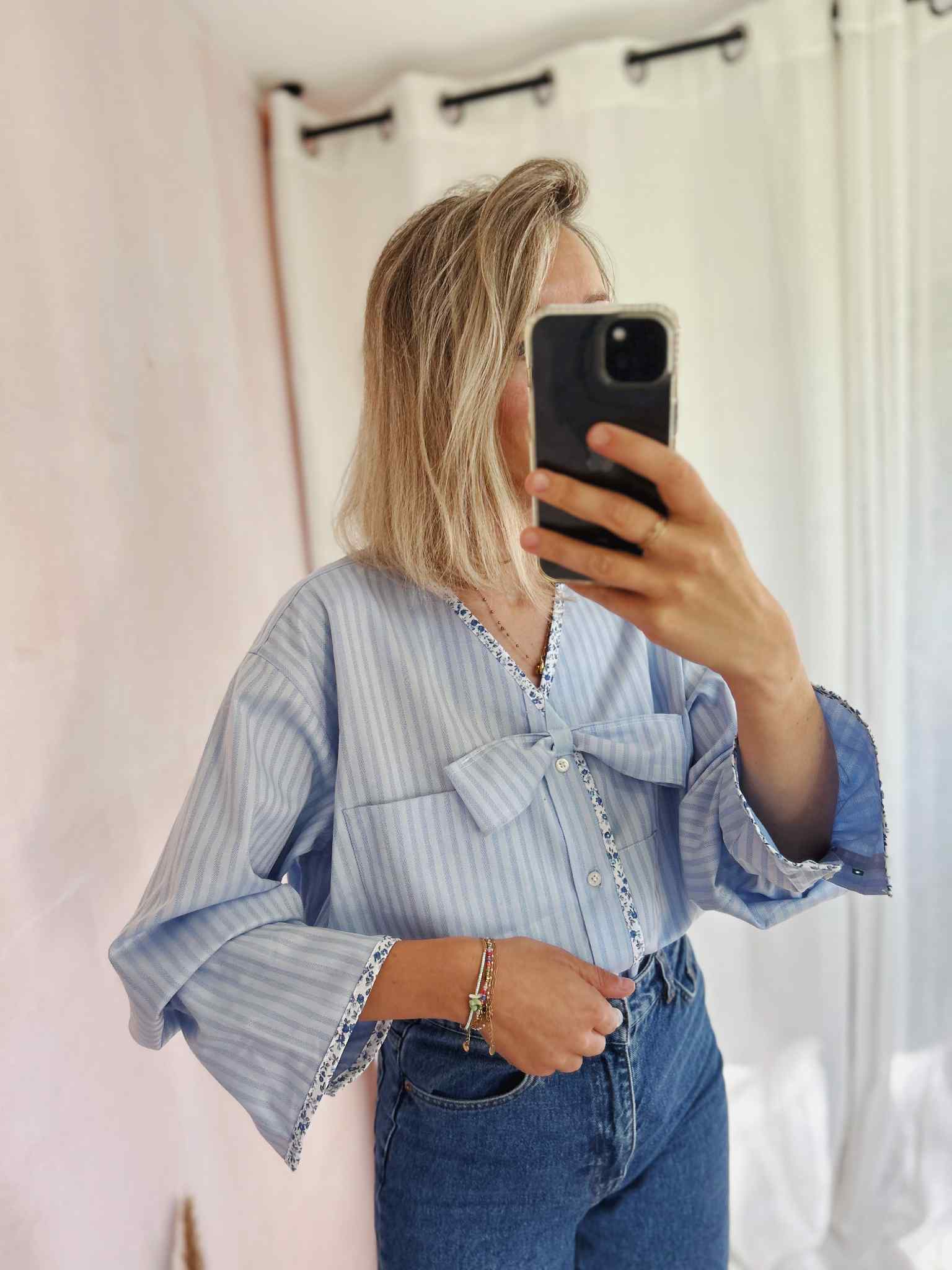 Chemise jacquard à rayures / col V orné d'un noeud / biais liberty / bas de manches élastiqués