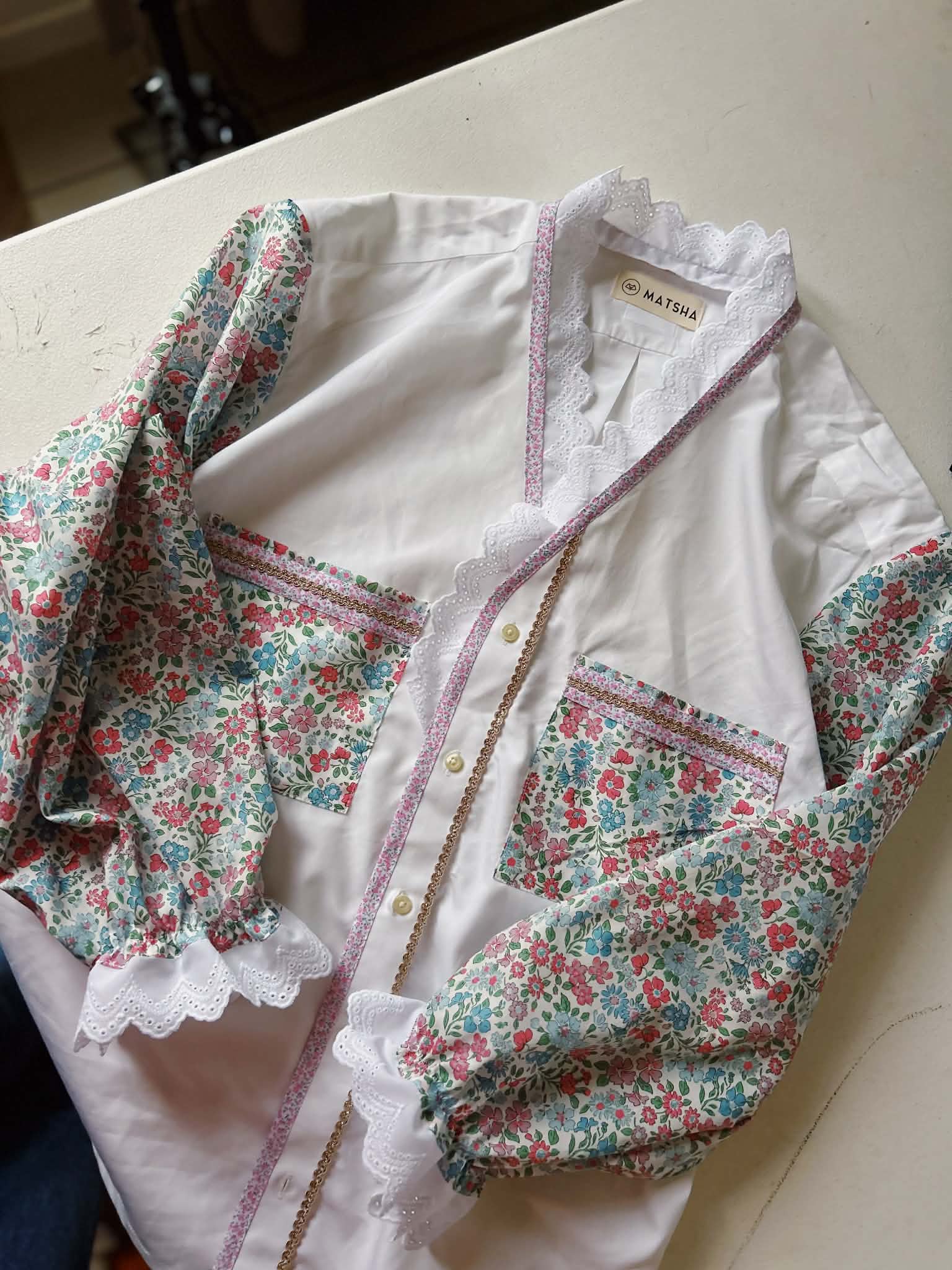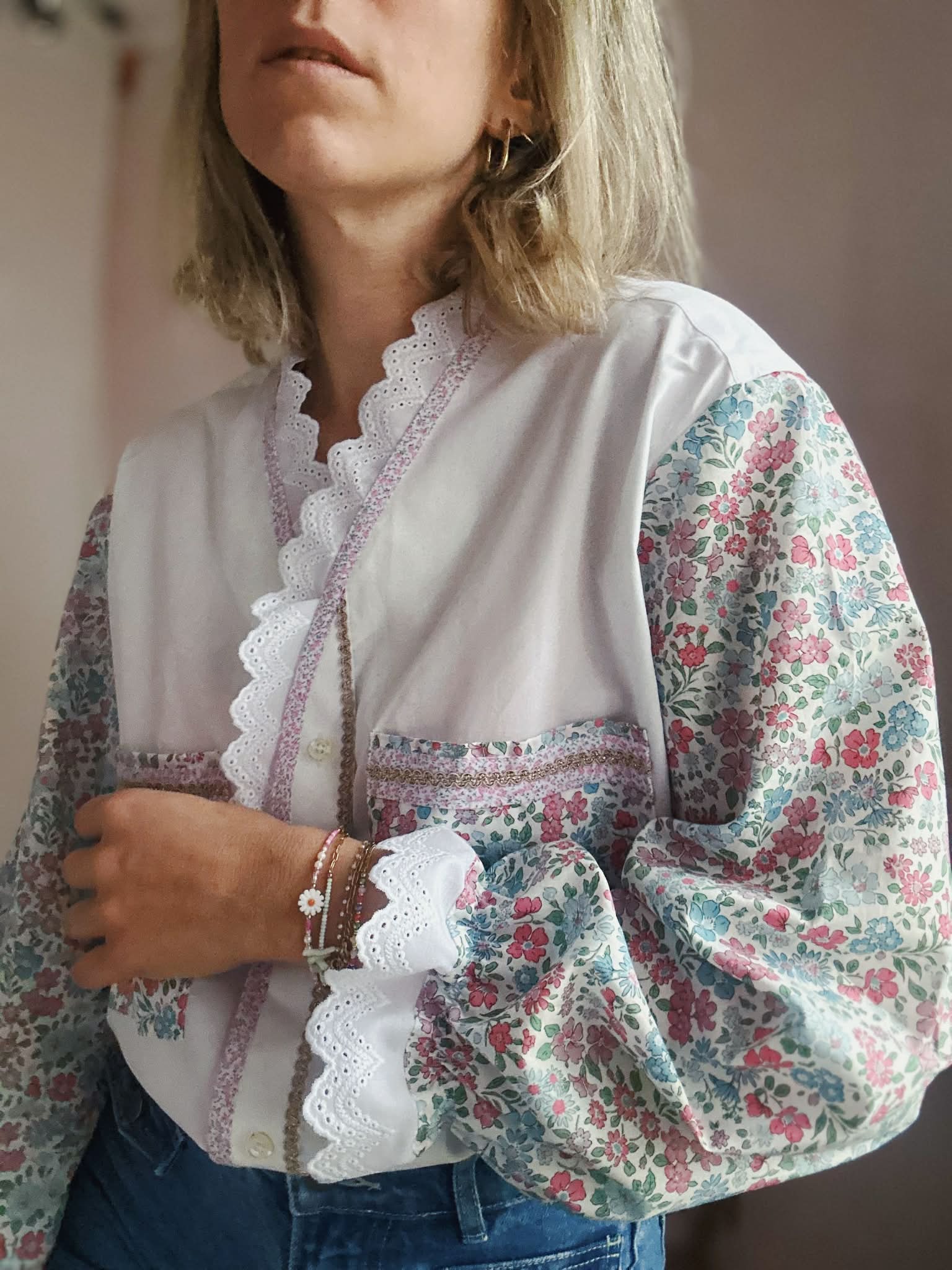 Base chemise blanche / col orné de broderie anglaise / finition biais coton liberty / doubles poches liberty fabrics et manches liberty fabrics / bas de manches élastiqués