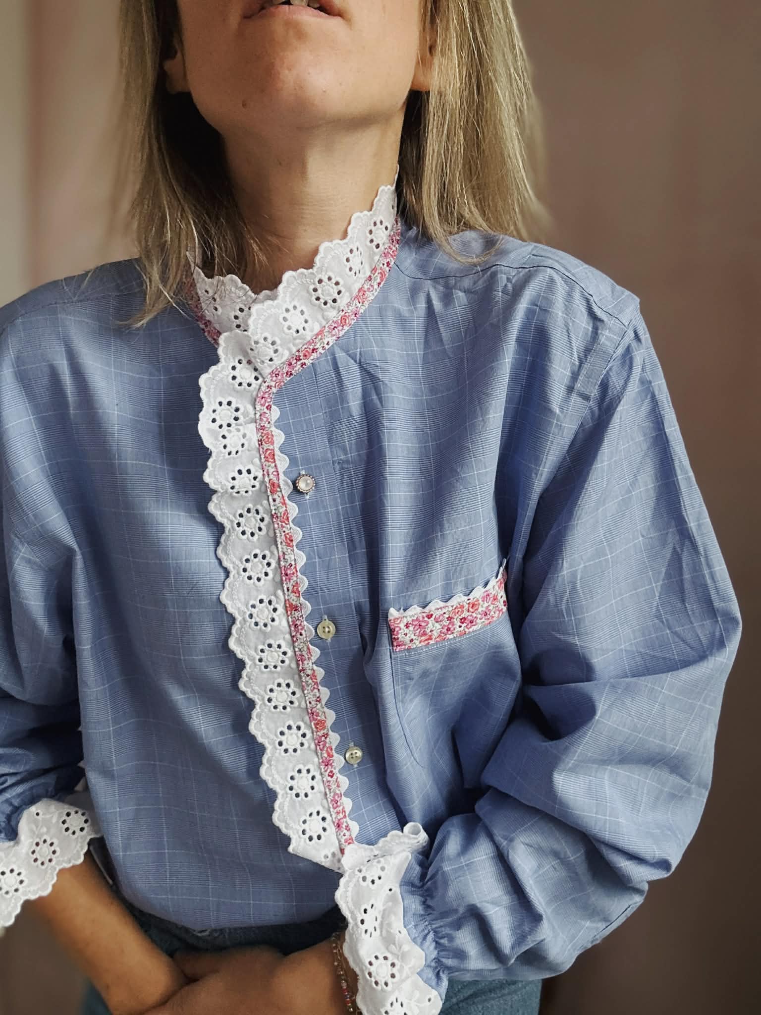 Chemise orné d'une broderie anglaise milieu devant et encolure / finition biais liberty / bas de manches élastiqués en broderie anglaise / bouton bijou sur le haut de la chemise