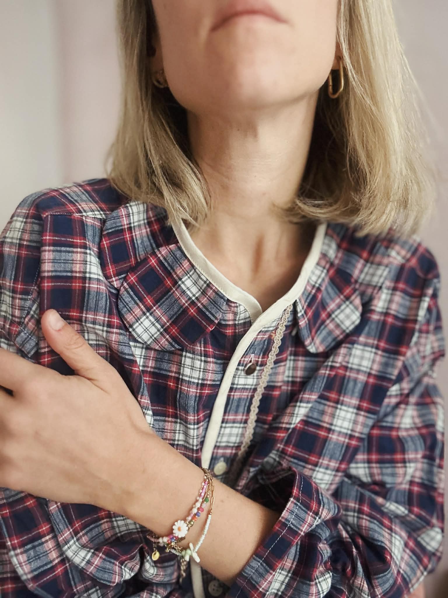 Les détails signature : encolure ornée de pétales / finition biais coton écru / bas de manches élastiqués / galon doré milieu devant