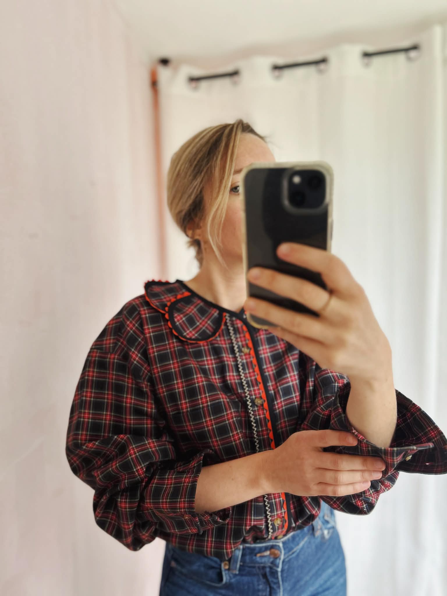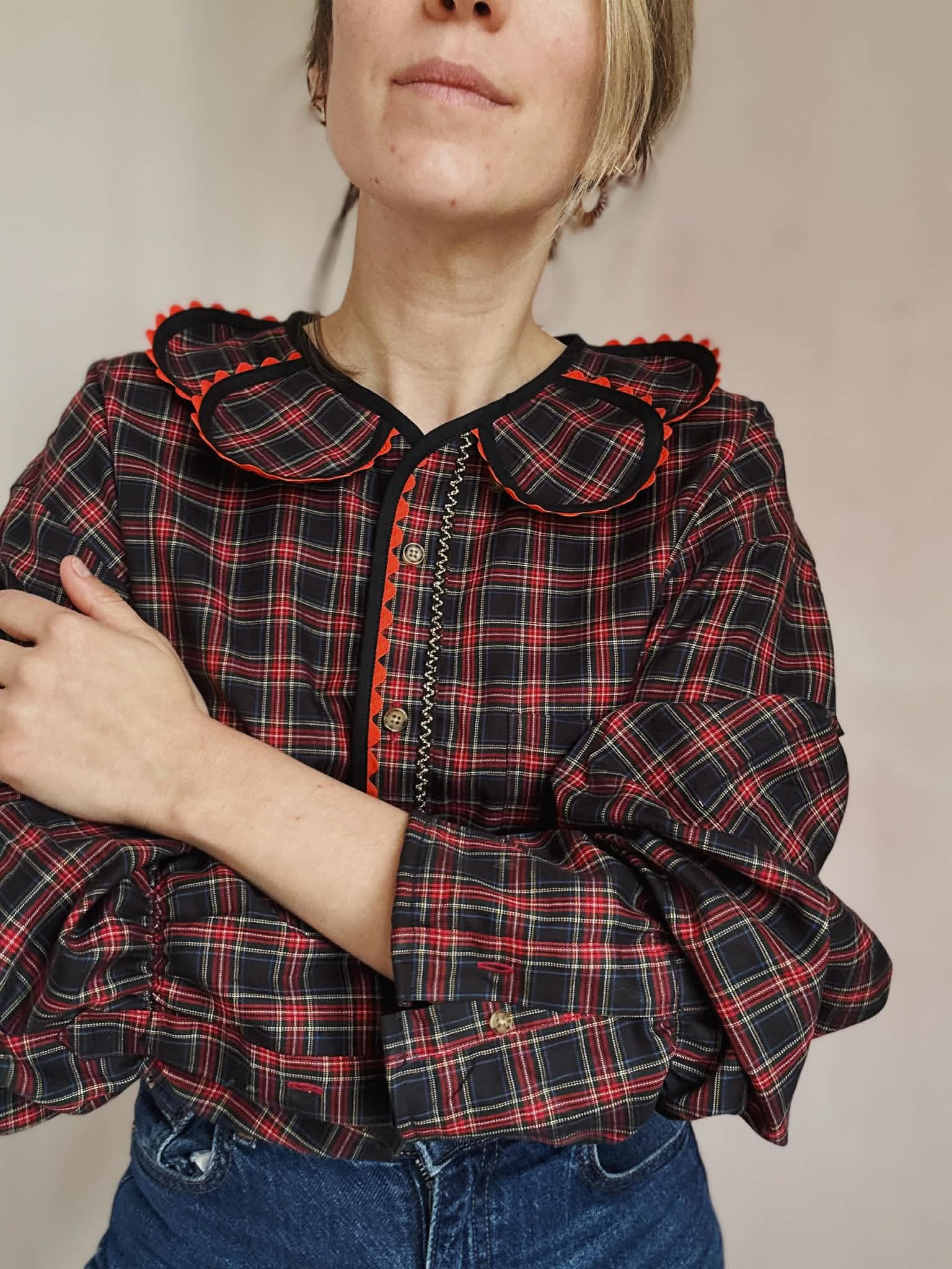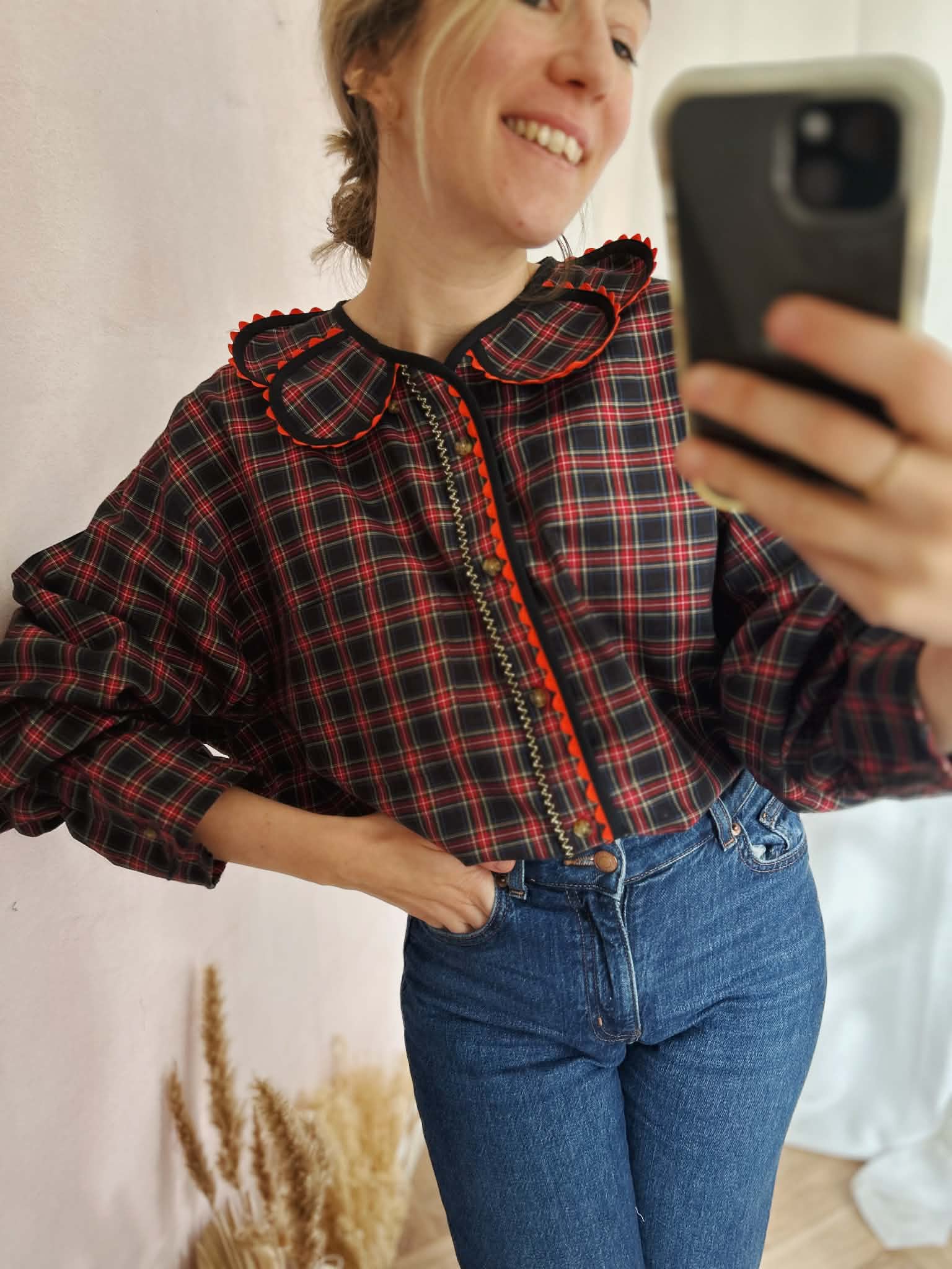 Les détails signature : encolure ornée de pétales bijoux / finition biais coton et croquet/ bas de manches élastiqués