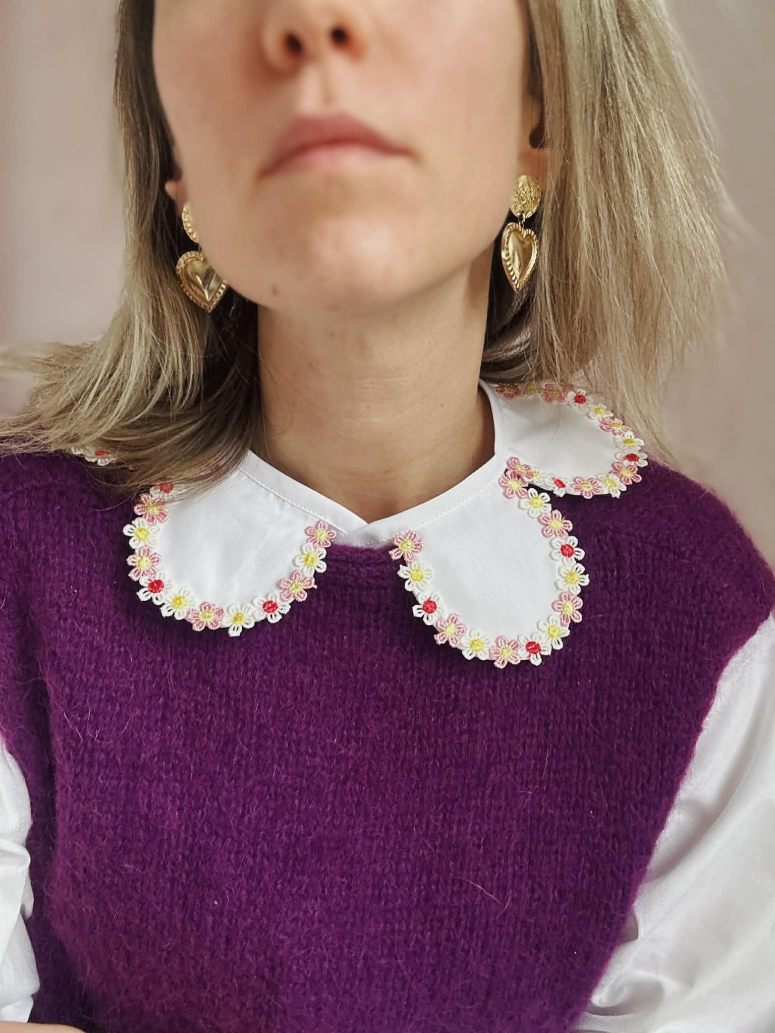 La version Daisy se caractérise par des inspirations bucoliques. Ses pétales ultra délicates sont soulignées par des fleurs en guipure découpées à la main et apposées une à une. Bouton bijou / bas de manches élastiqués et broderie anglaise / boutonnage orné de perles