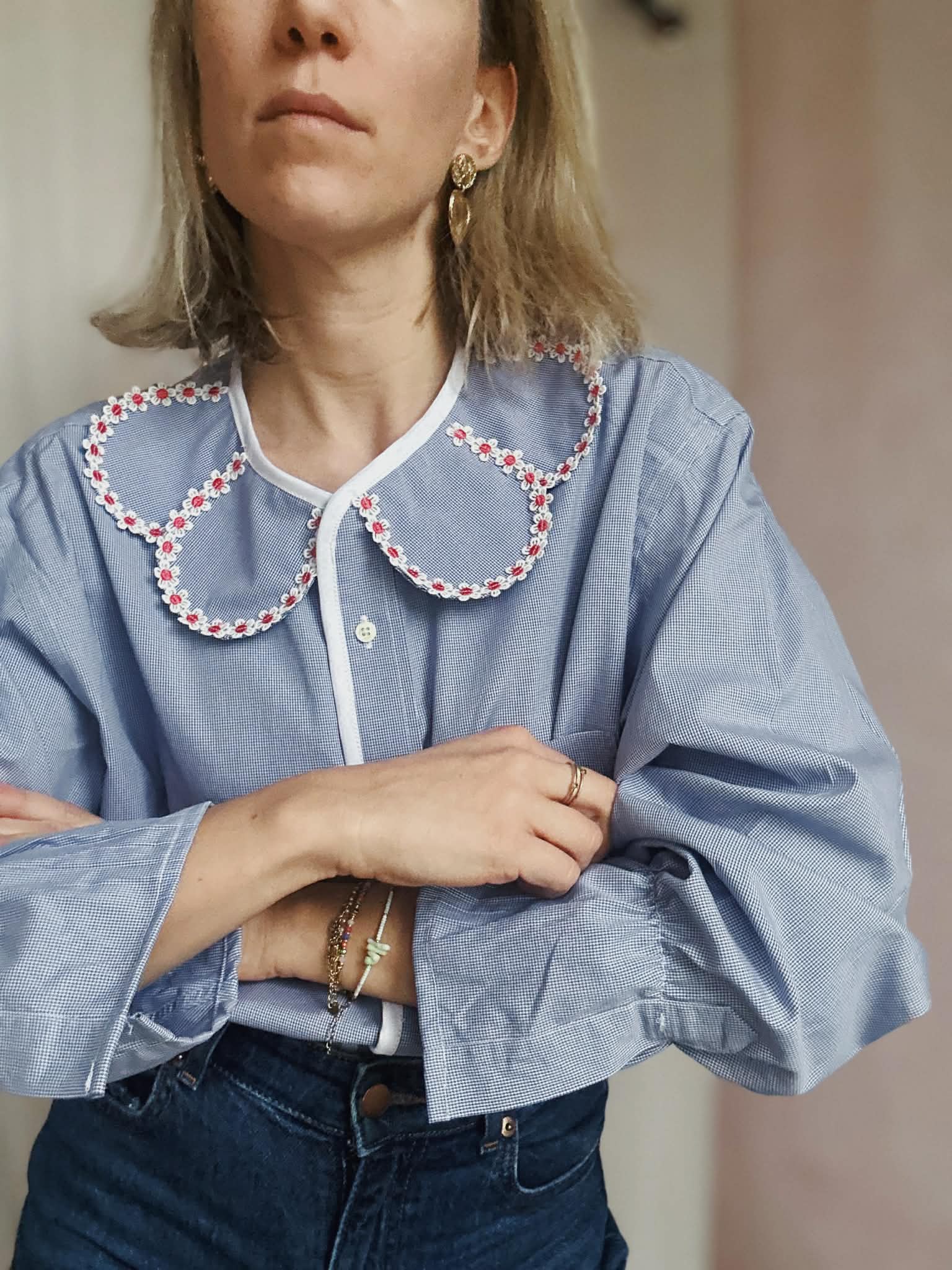 Les détails signature : encolure ornée de maxi pétales soulignées d'un galon de marguerites / finition biais coton / bas de manches élastiqués