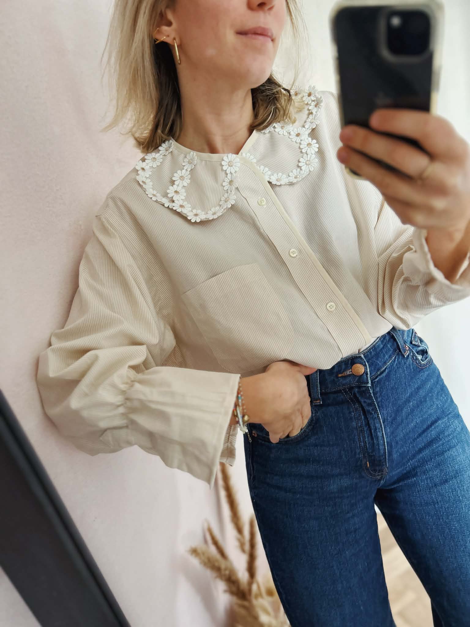 Les détails signature : encolure ornée de maxi pétales soulignées d'un galon de grandes marguerites / finition biais coton / bas de manches élastiqués