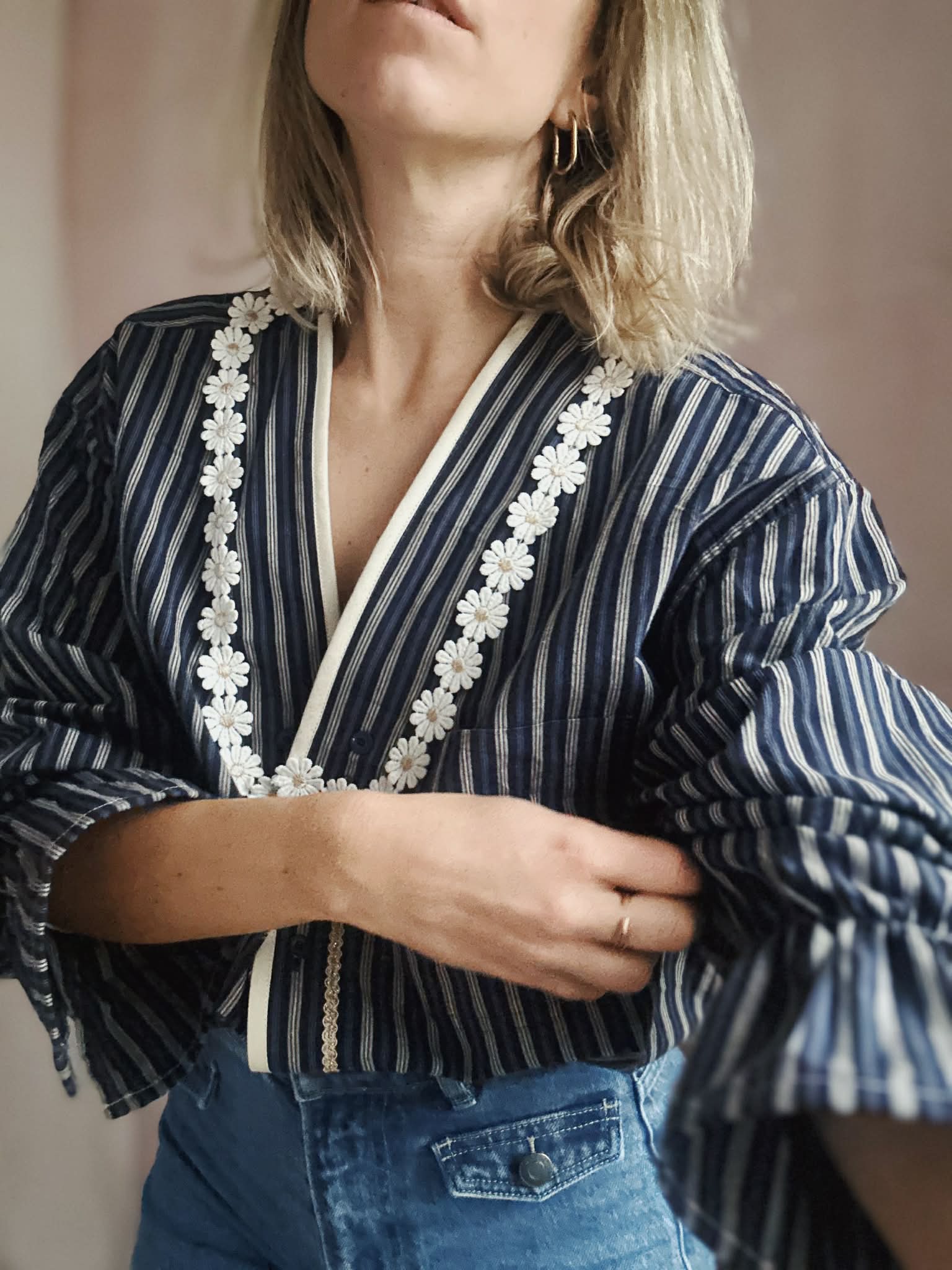 Les détails signature : col V avec empiècements soulignés d'un galon de marguerites/ bas de manches élastiqués / Finition biais coton et galon doré