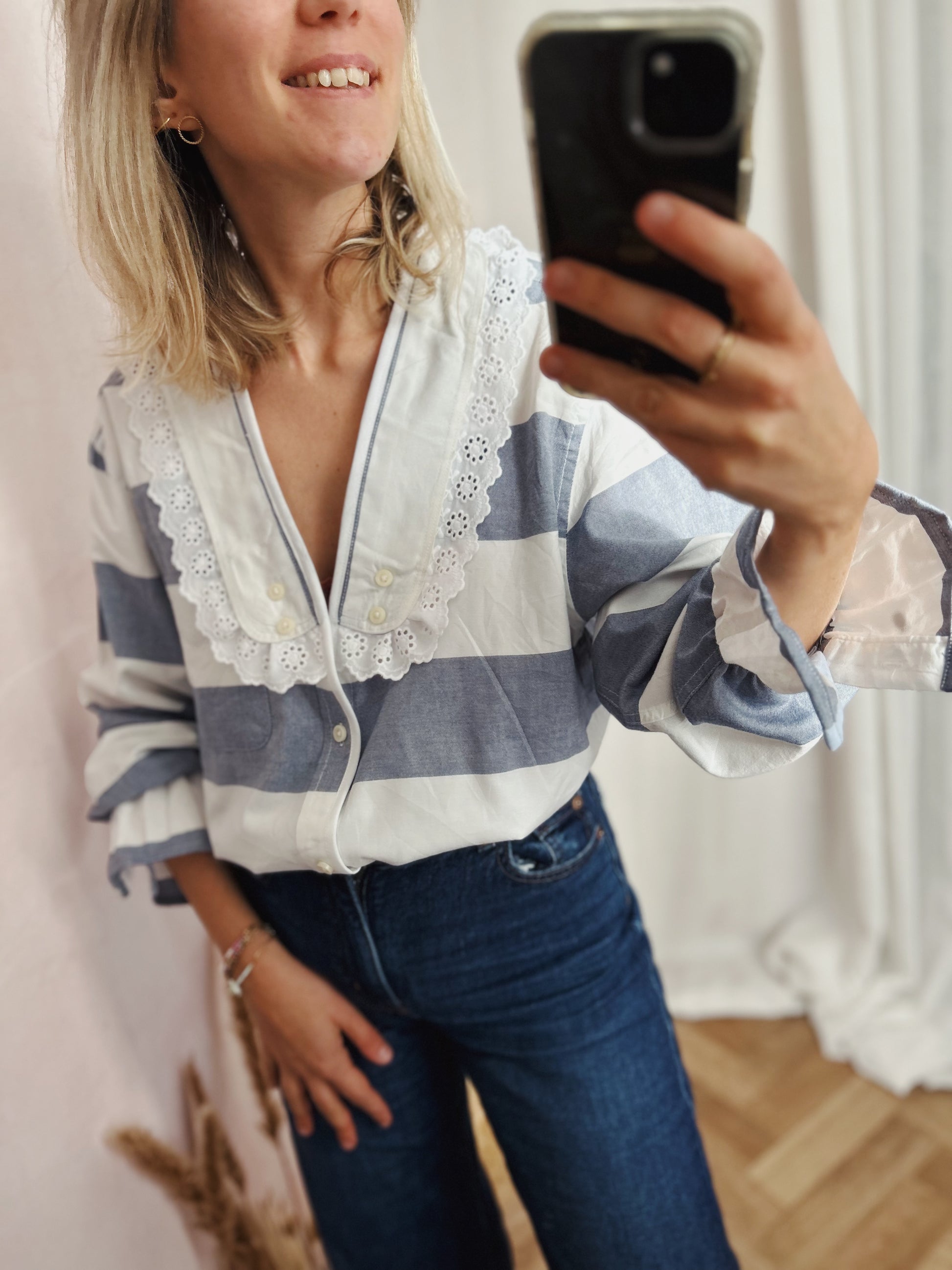 Les détails signature : col V avec empiècements soulignés d'une broderie anglaise / bas de manches élastiqués / finition biais coton blanc milieu devant
