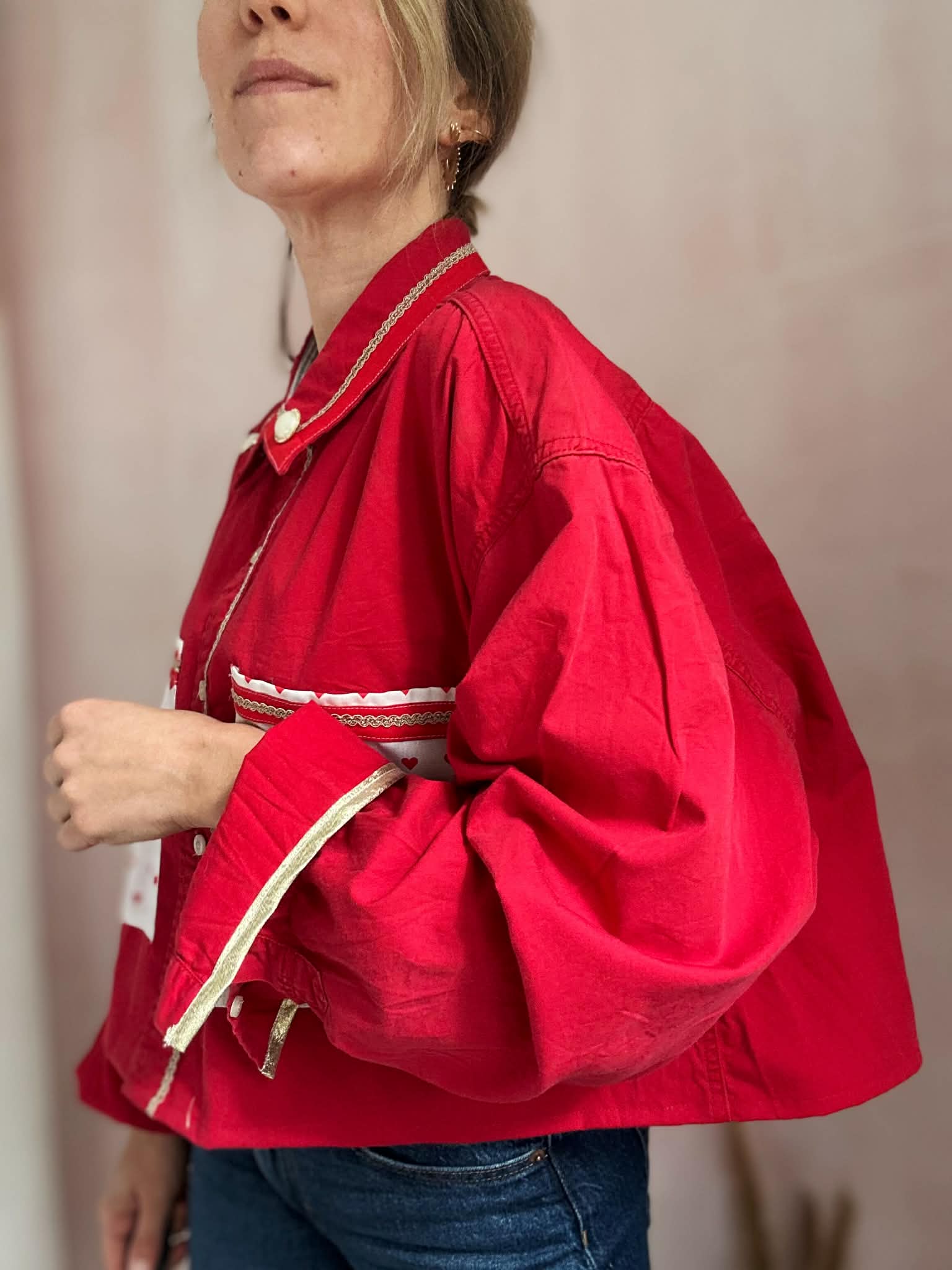 SurChemise coupe courte / Col orné d'un biais en coton, galon doré brodé de boutons bijoux / maxis poches imprimées / bas de manches élastiqués soulignés d'un biais doré