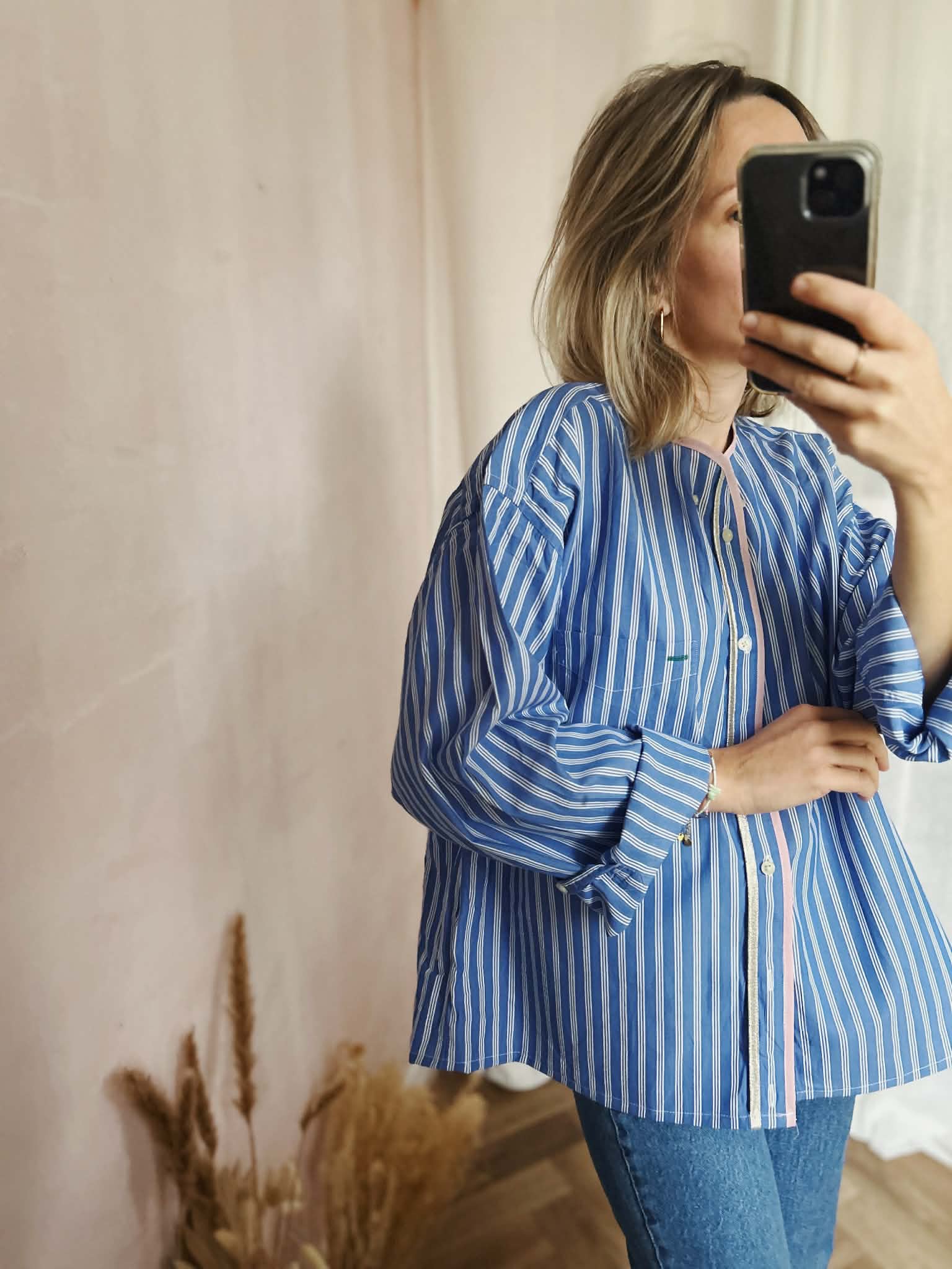 Chemises à rayures / encolure et milieu devant soulignés d'un biais coton rose et d'un biais doré / bas de manches à retrousser à votre guise