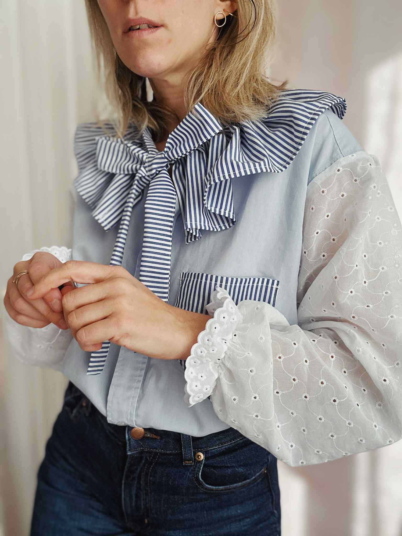 Base chemise bleu ciel / manches en broderie anglaise* / col à nouer rayé / poche devant / bas de manches élastiqués