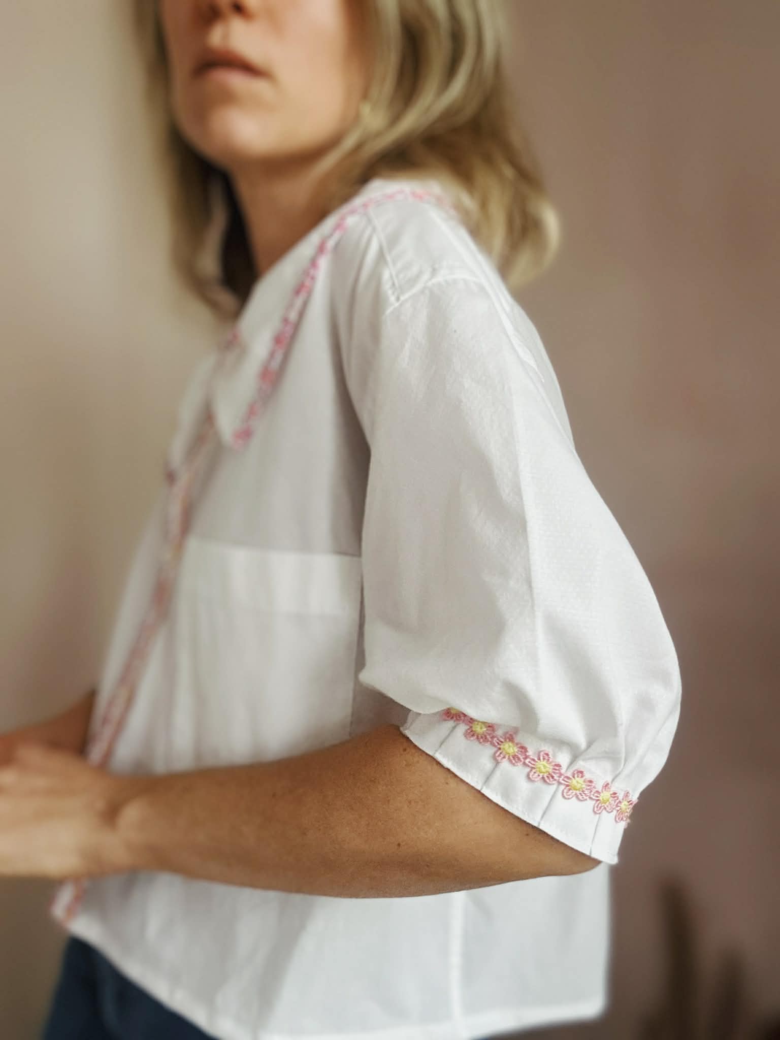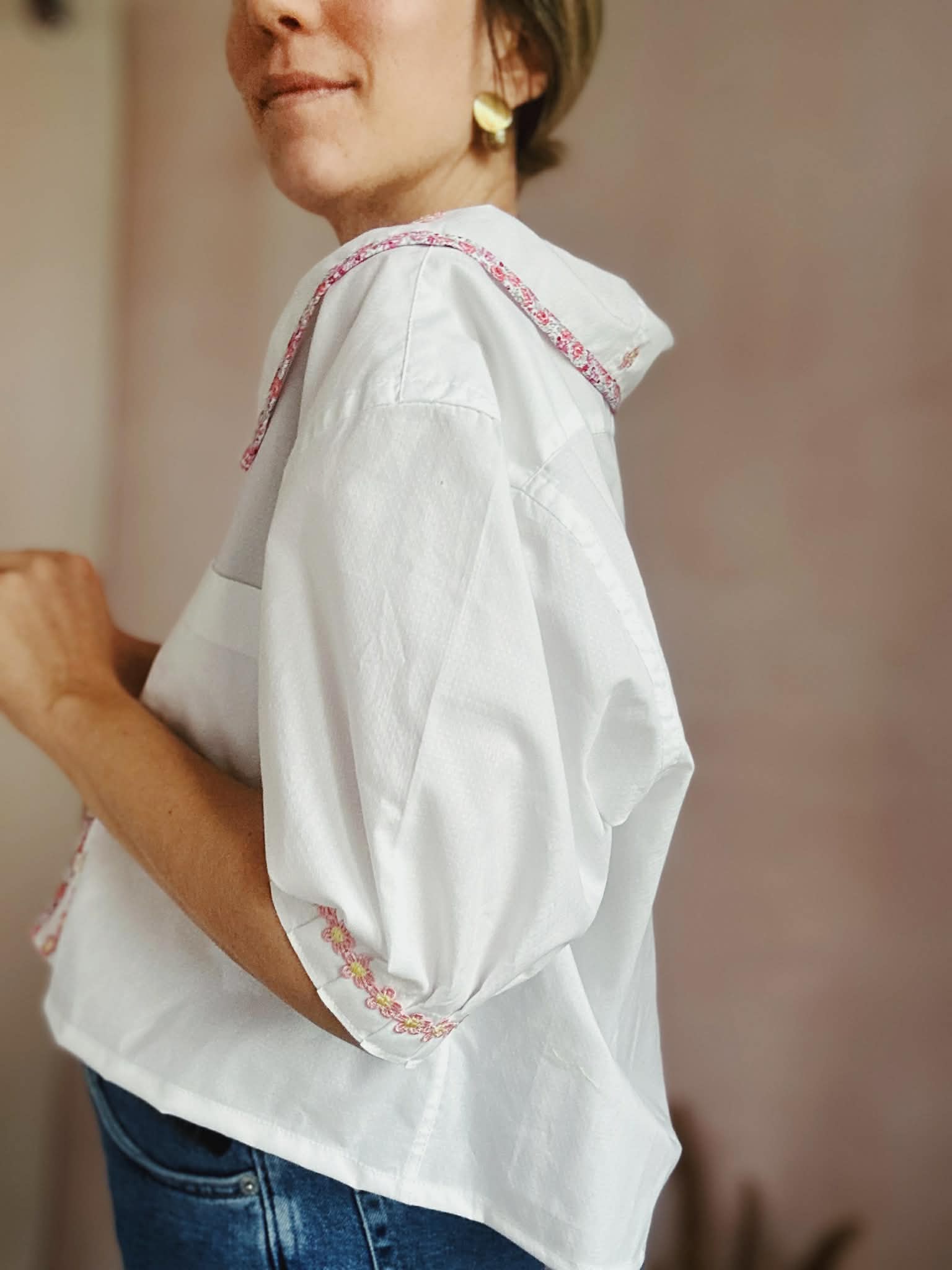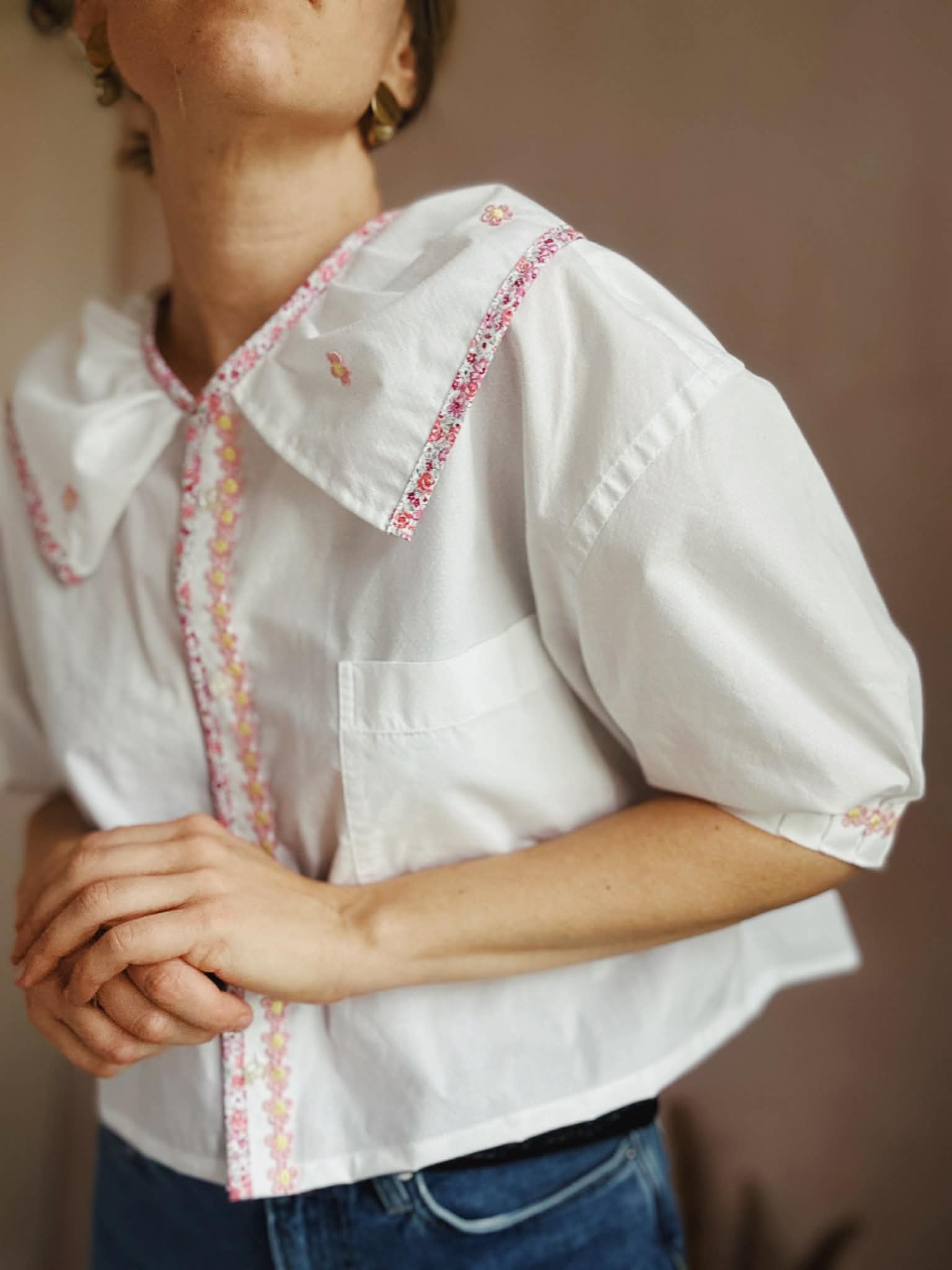 Chemise manches boules ornés d'une guipure fleurie / volant encolure / biais liberty