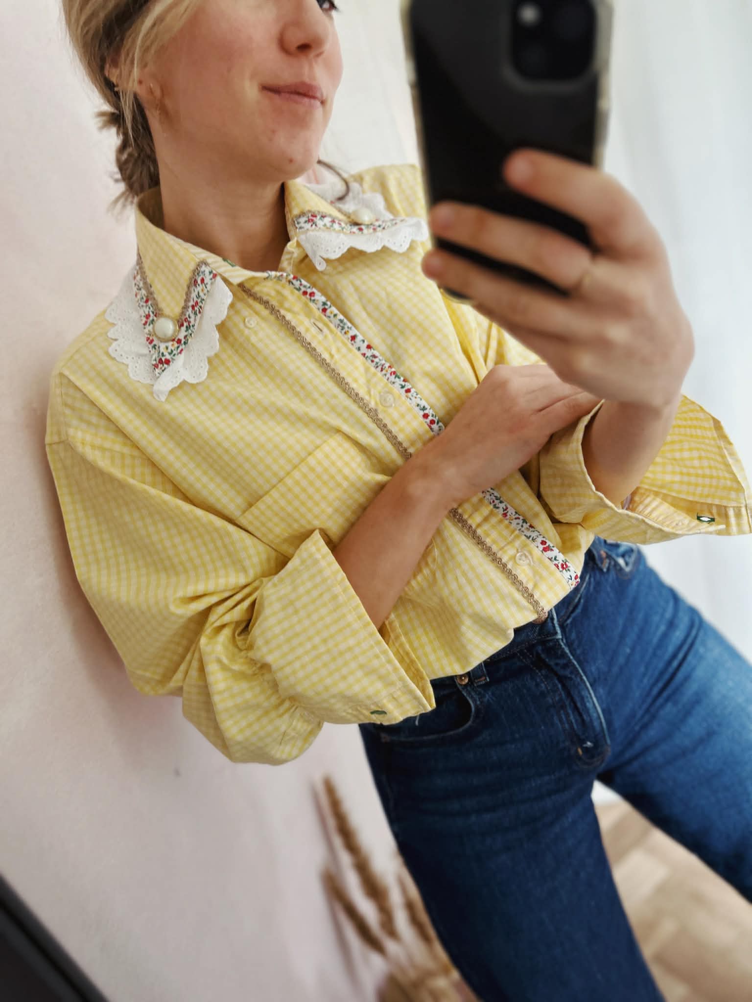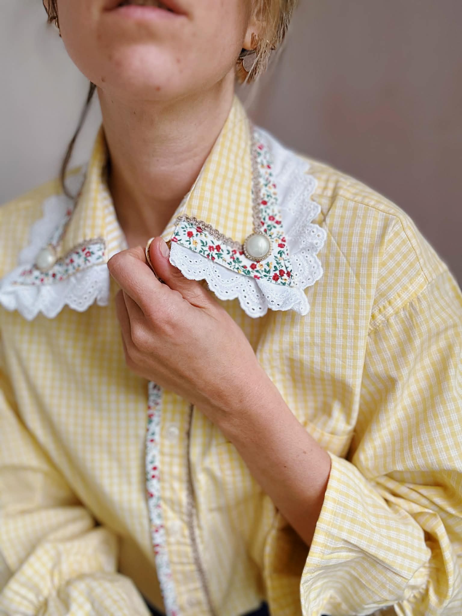 Col en broderie anglaise brodé de boutons bijoux et orné d'un biais liberty et galon doré/ /bas de manches élastiqués