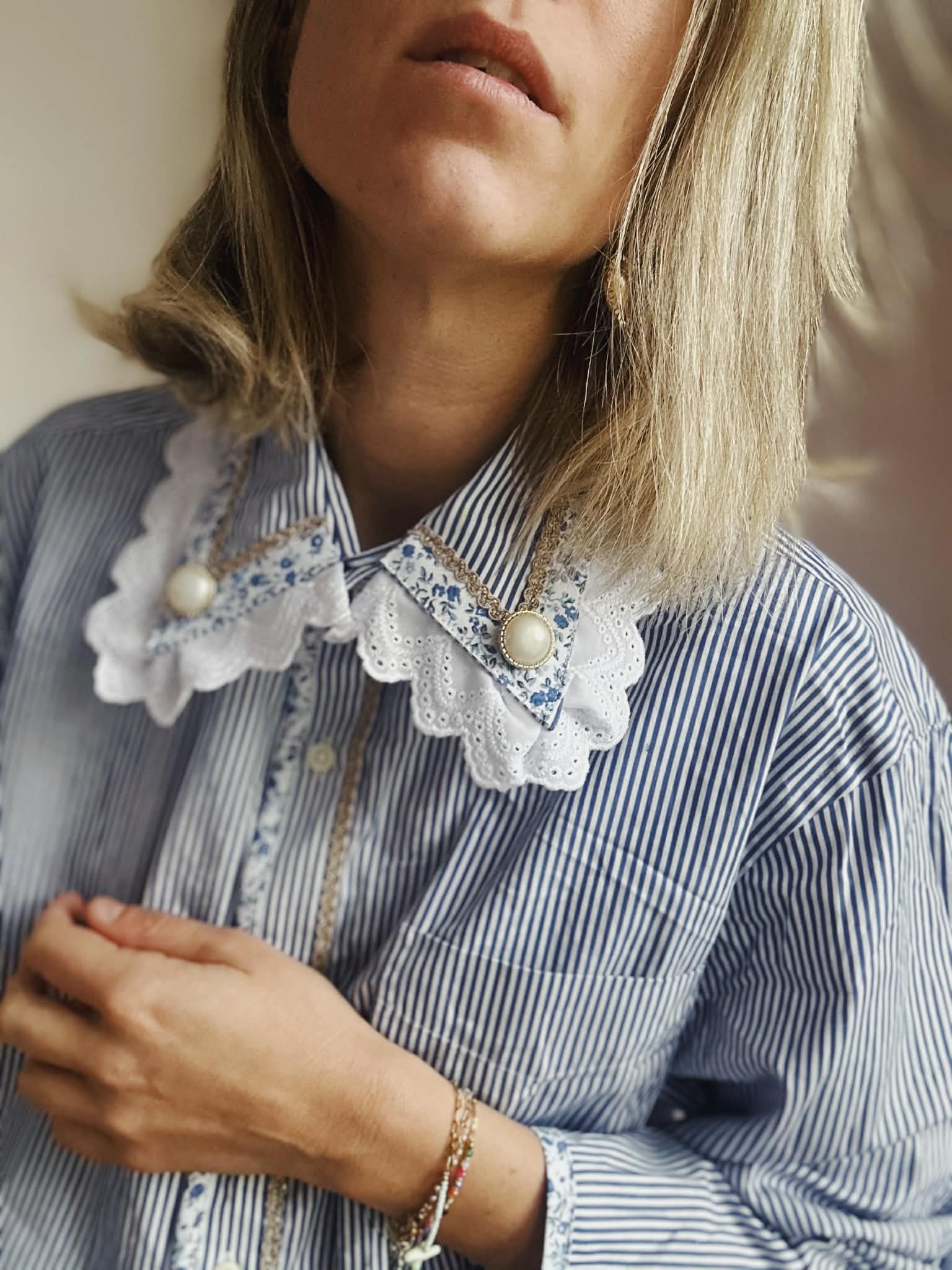 Col en broderie anglaise brodé de boutons bijoux et orné d'un galon de marguerites/ biais liberty soulignant le col et le milieu devant /bas de manches élastiqués