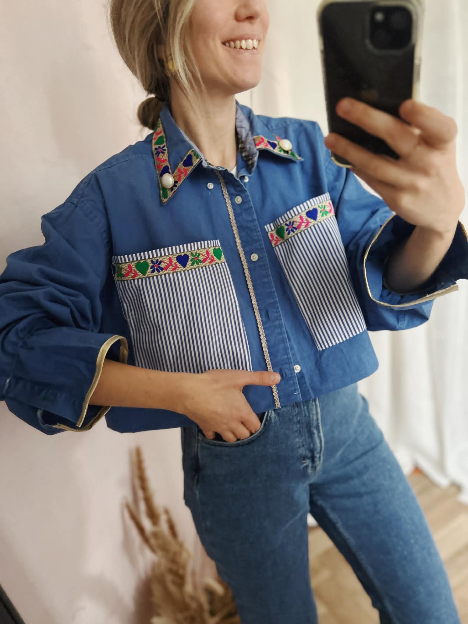 Chemise coupe courte / Col orné d'un galon jacquard brodé de boutons bijoux / maxis poches rayures/ bas de manches élastiqués soulignés d'un biais doré