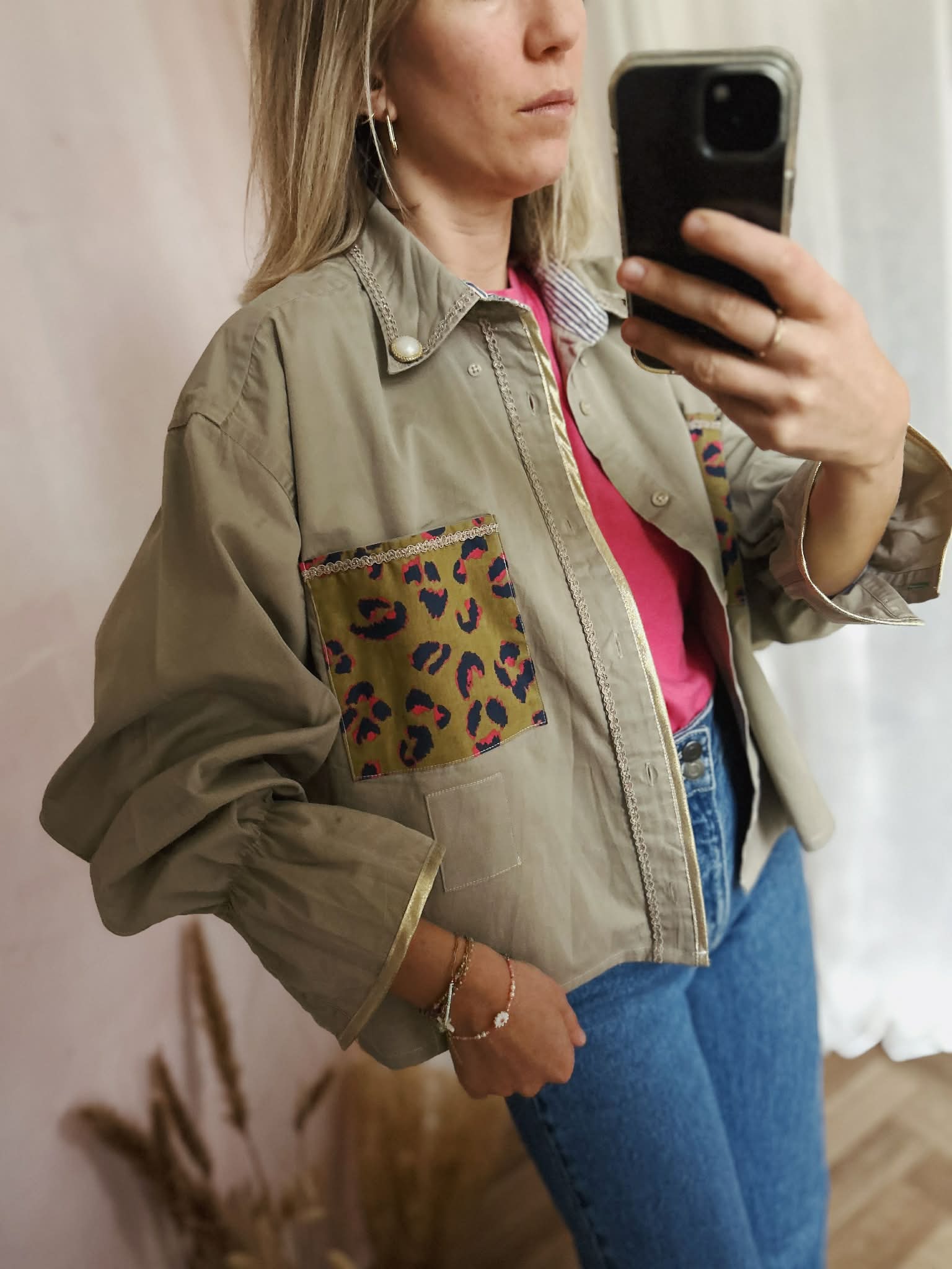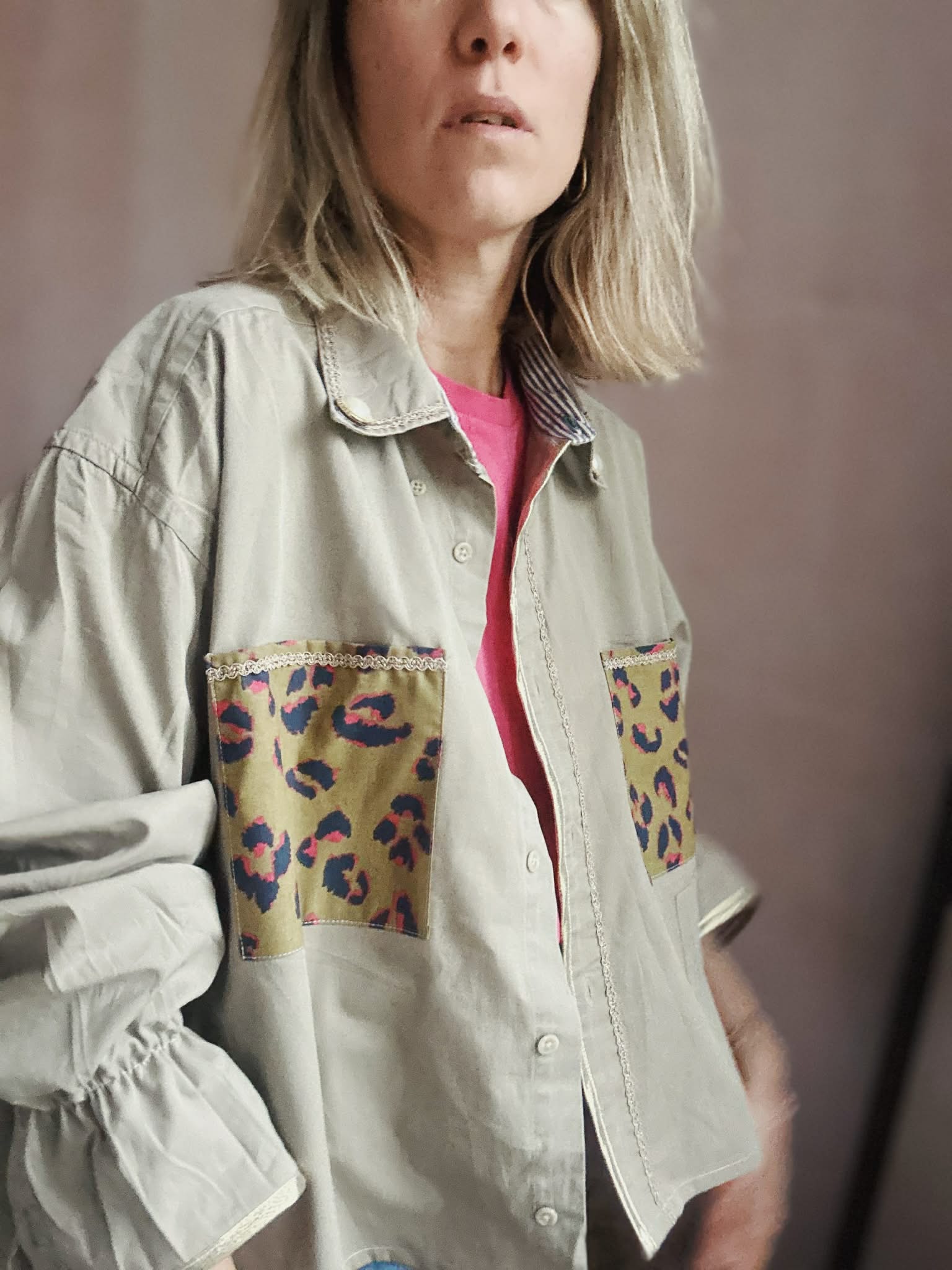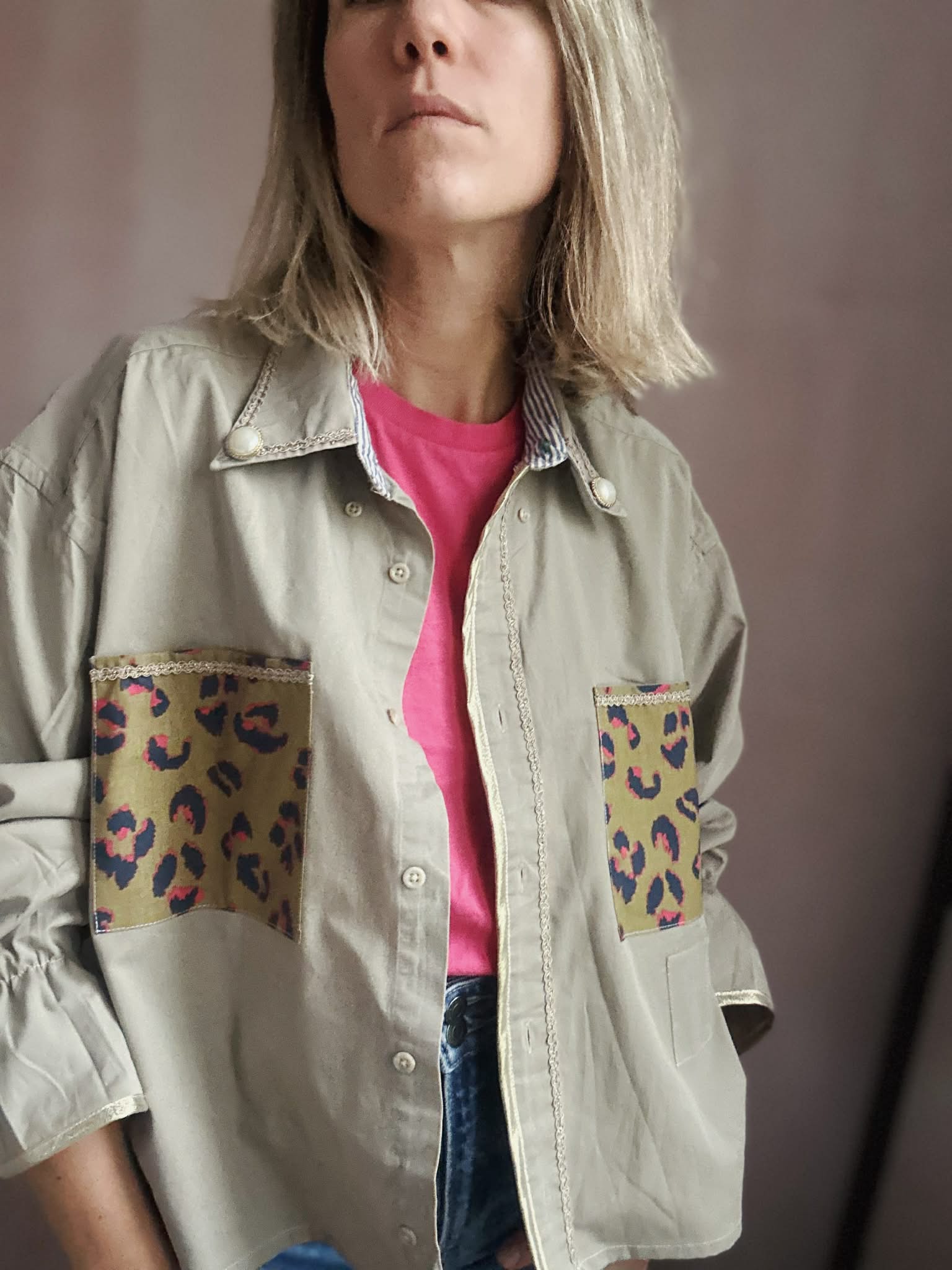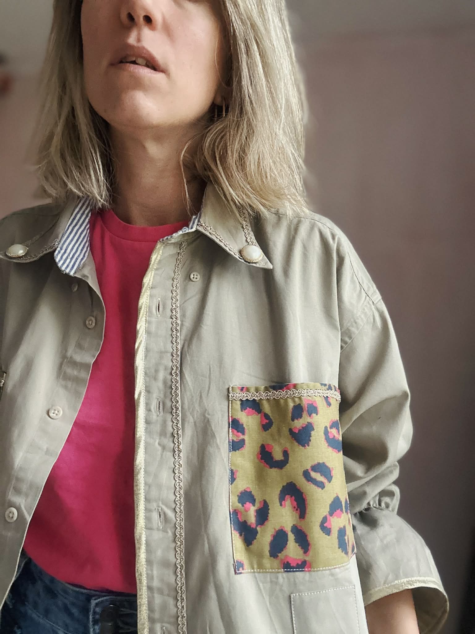 Chemise doubles poches imprimées léopard / bas de manches élastiqués soulignés d'un biais doré / boutons bijoux sur le col souligné d'un galon doré /